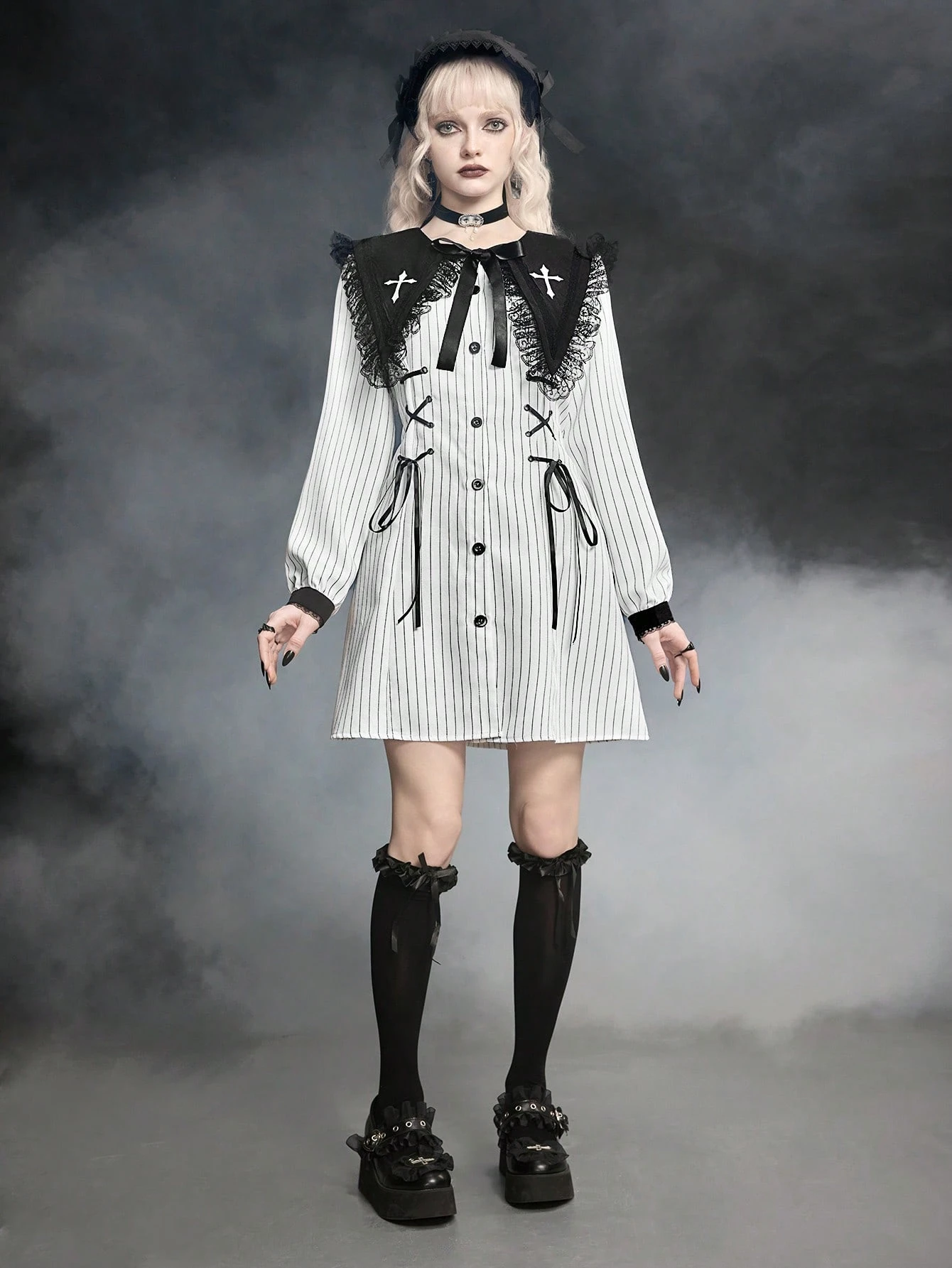 Gothic Dark Doll Cross Pointed Collar Contrast Lace Striped Fitted A-Line Mini Dress