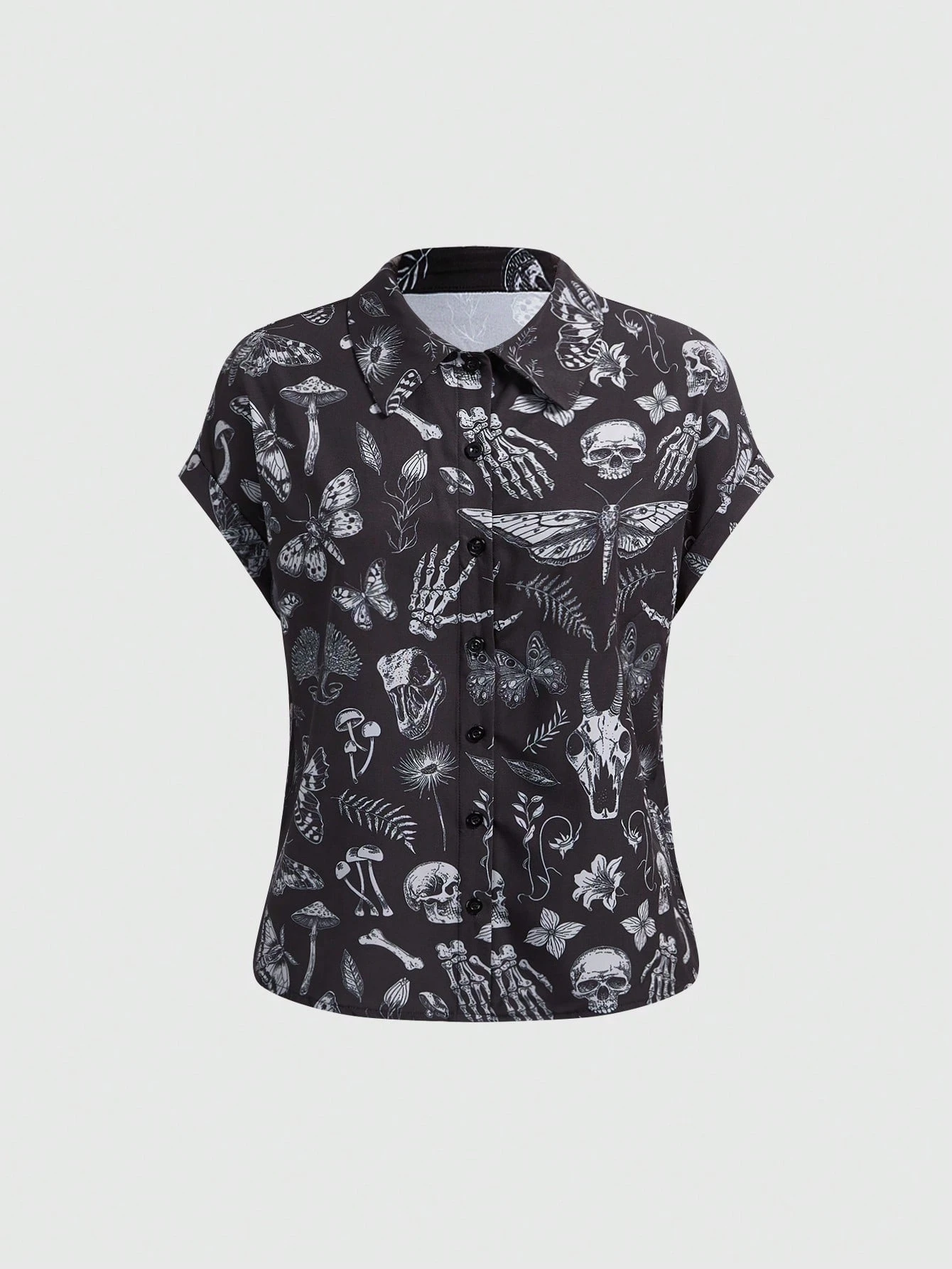 Gothic Dark Floral Botanical Garden Skull Mushroom Sun Moon Star Print Button-Up Shirt For Women, Spring/Summer