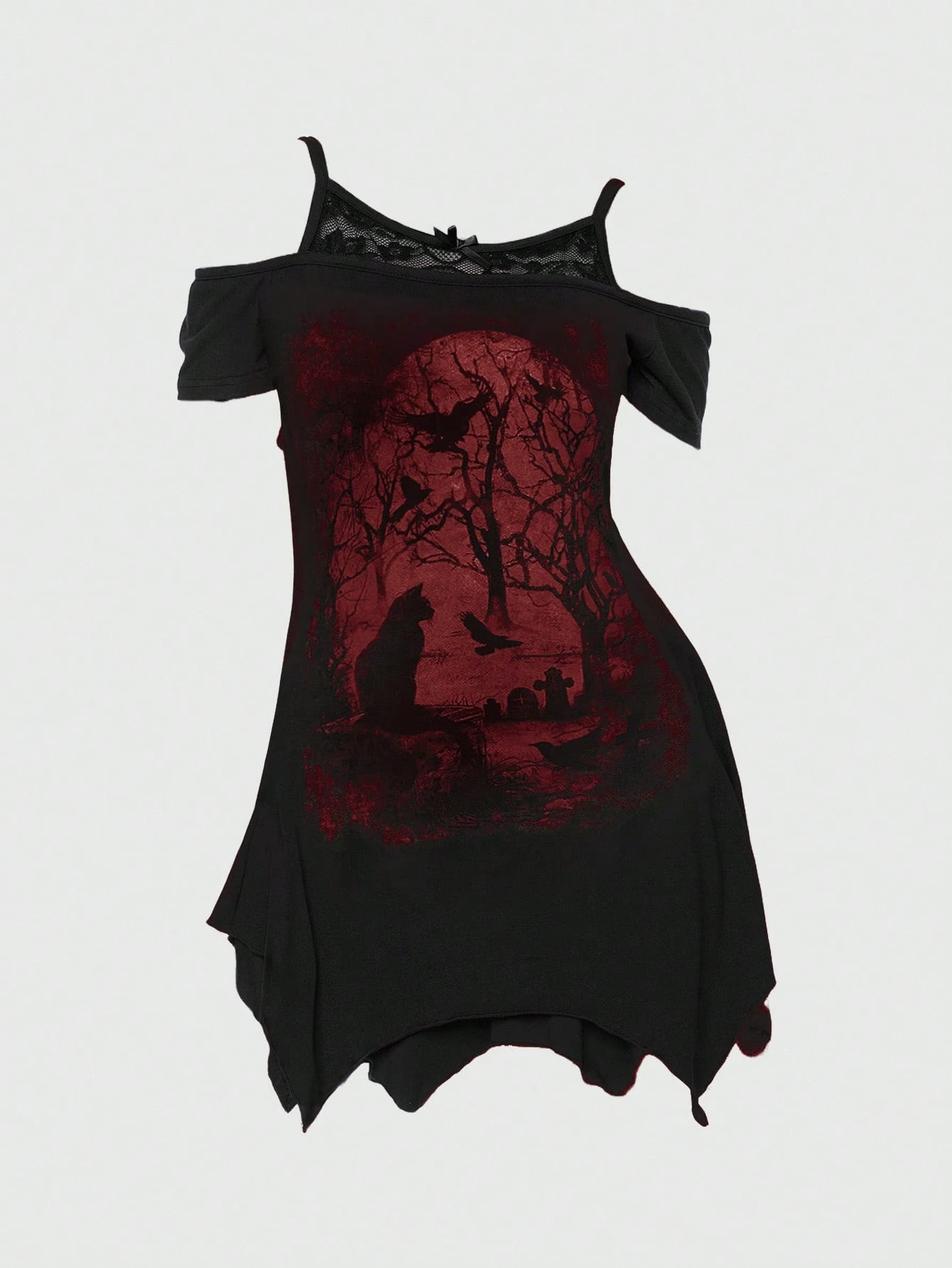 Goth Gothic Dark Forest Crow & Dead Tree Pattern Off Shoulder Strap Asymmetrical Hem Lace Patchwork Black Gothic Vine Short Sleeve Open Shoulder Women T-Shirt