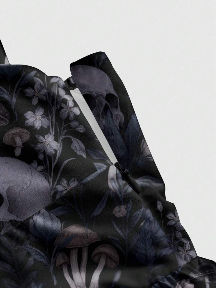 Gothic Dark Forest Vintage Skeleton Mushroom Leaf Print Slip Dress For Women