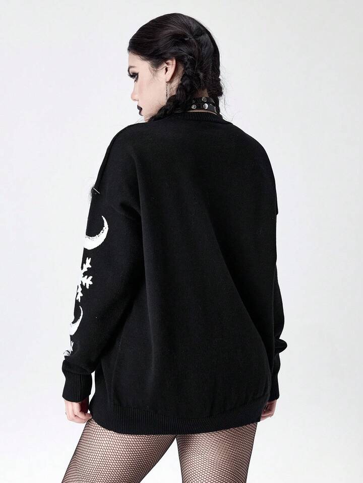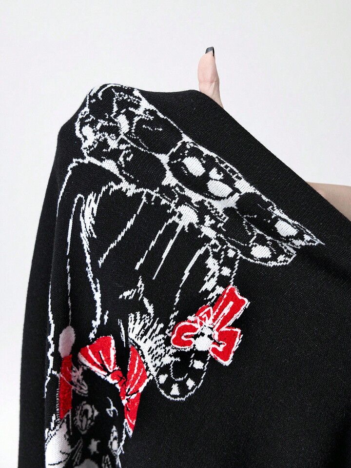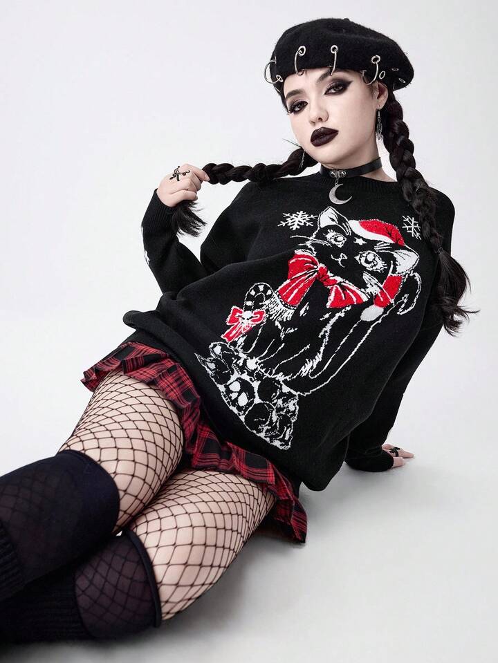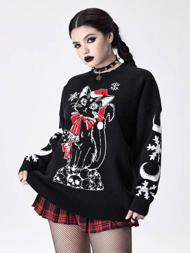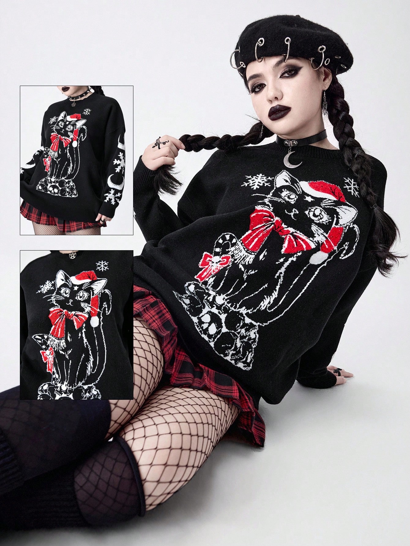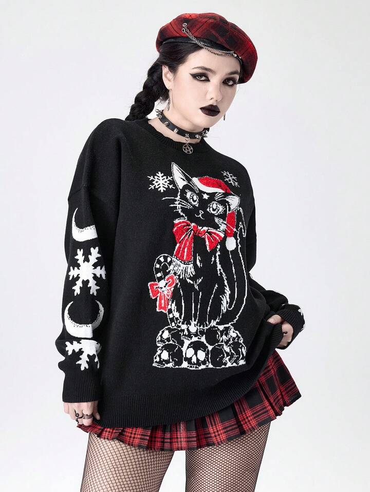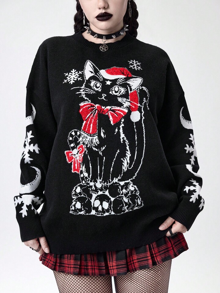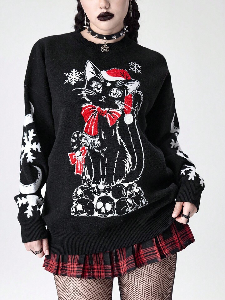 Gothic Dark Mysterious Cat Skeleton Christmas Intarsia Loose Pullover Sweater