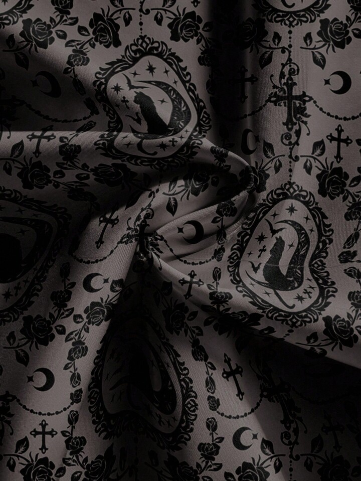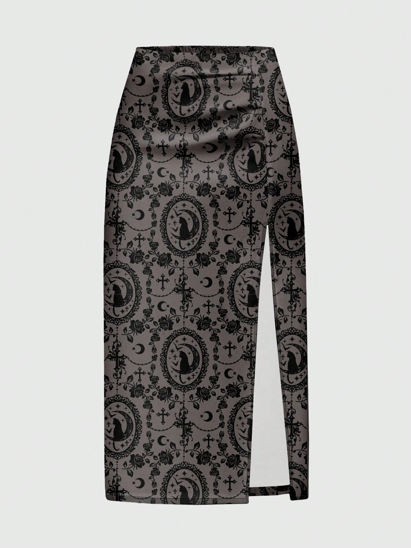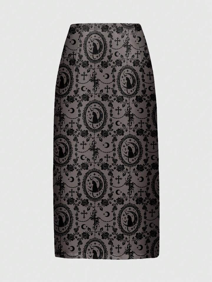 Gothic Dark Palace Mysterious Elegant Black Cat Cross Rose Women Skirt