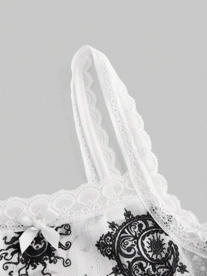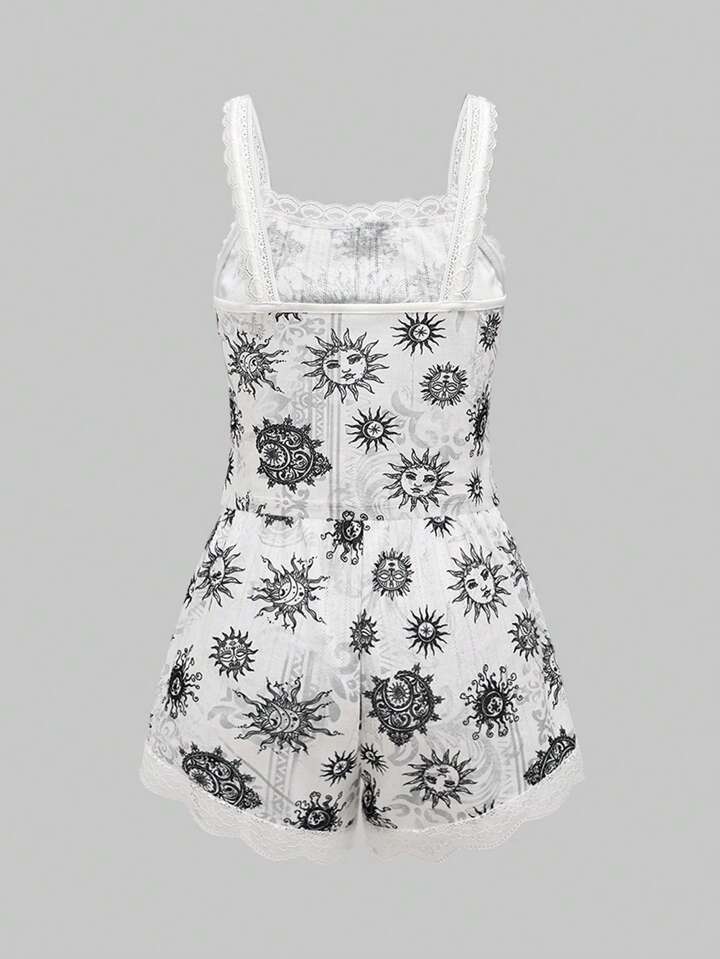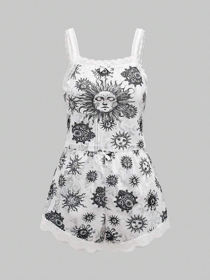 Gothic Dark Sun Face & Vine Moon & Star Patterns Splicing Lace & Bowknot Decor Cami Top & Shorts Pajama Set