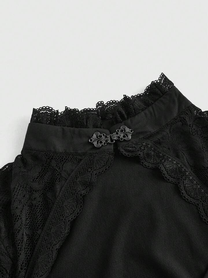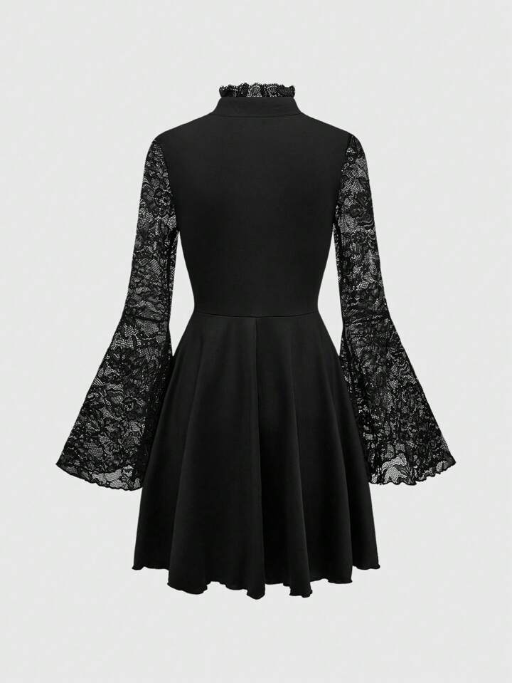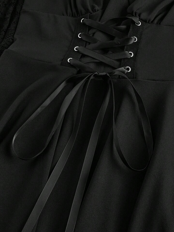 Gothic Elegant Velvet Patchwork Lace Waist Lace Up Dress For Halloween, For New Year
