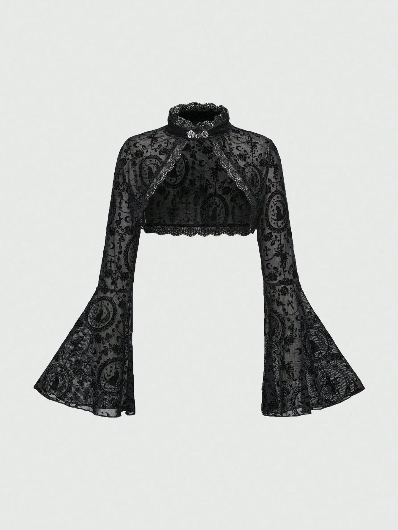 Goth Gothic Flare Sleeve Women's Vintage Mysterious Cat Moon Vine Flocked Cardigan