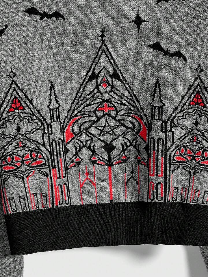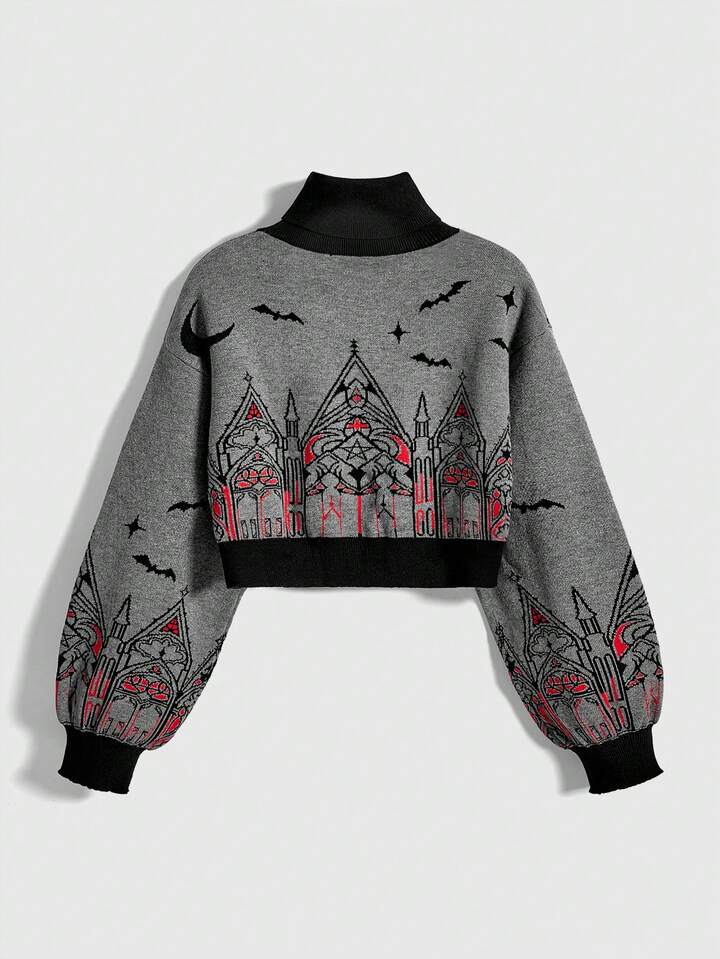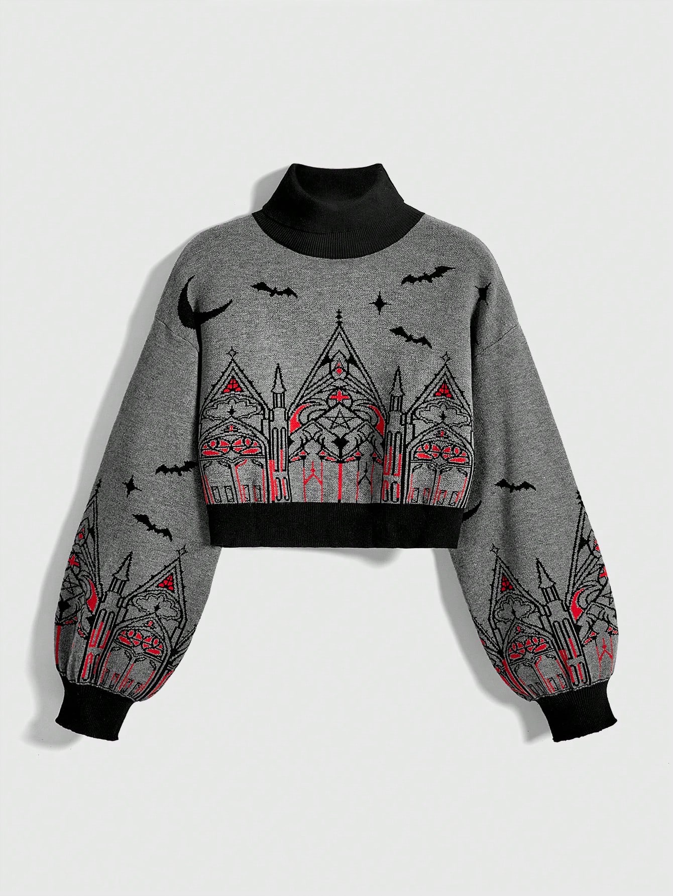 Gothic Halloween Castle & Cross Pattern Women's Turtleneck Contrast Color Pullover Sweater