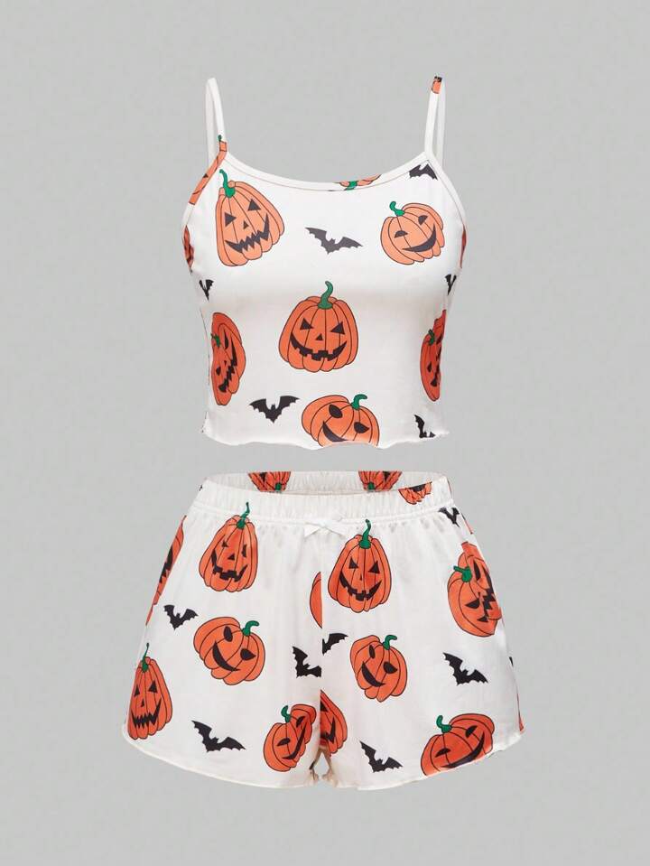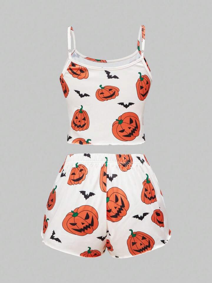 Gothic Halloween Pumpkin & Bat Print Camisole & Shorts Pajama Set