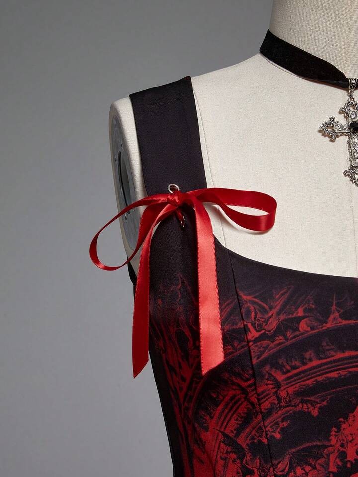 Gothic Medieval Palace Style Church & Castle Print Contrast Color Low-Cut Fitted Lace-Up Camisole