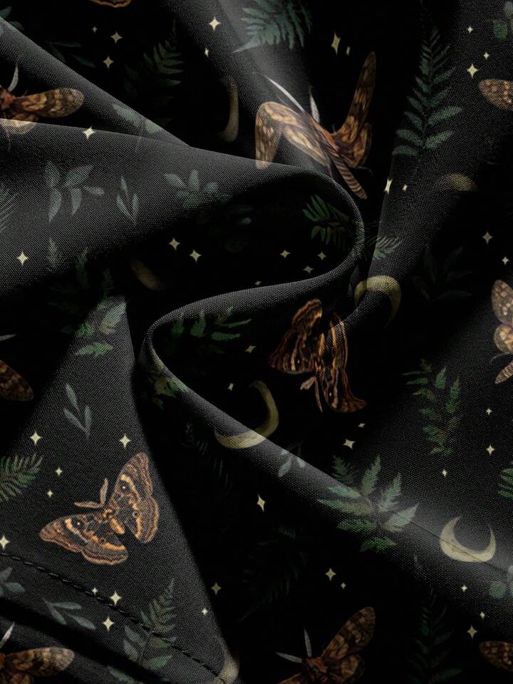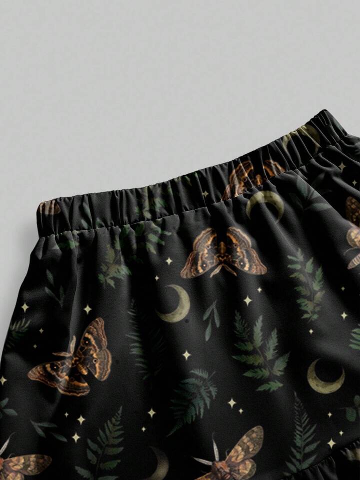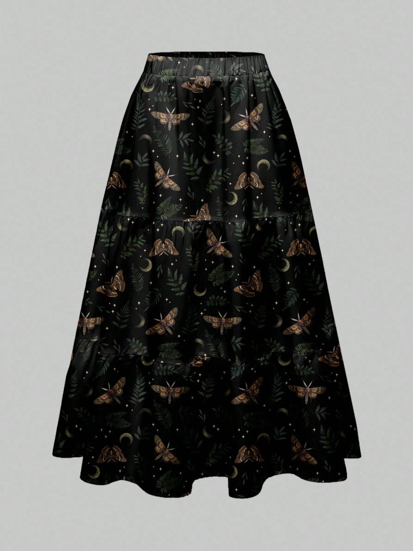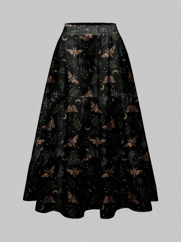 Gothic Mystic Dark Witch Leaf Plant Moon Moth Print Multi-Layer Flowy Skirt, Holiday 's Skirt, Halloween