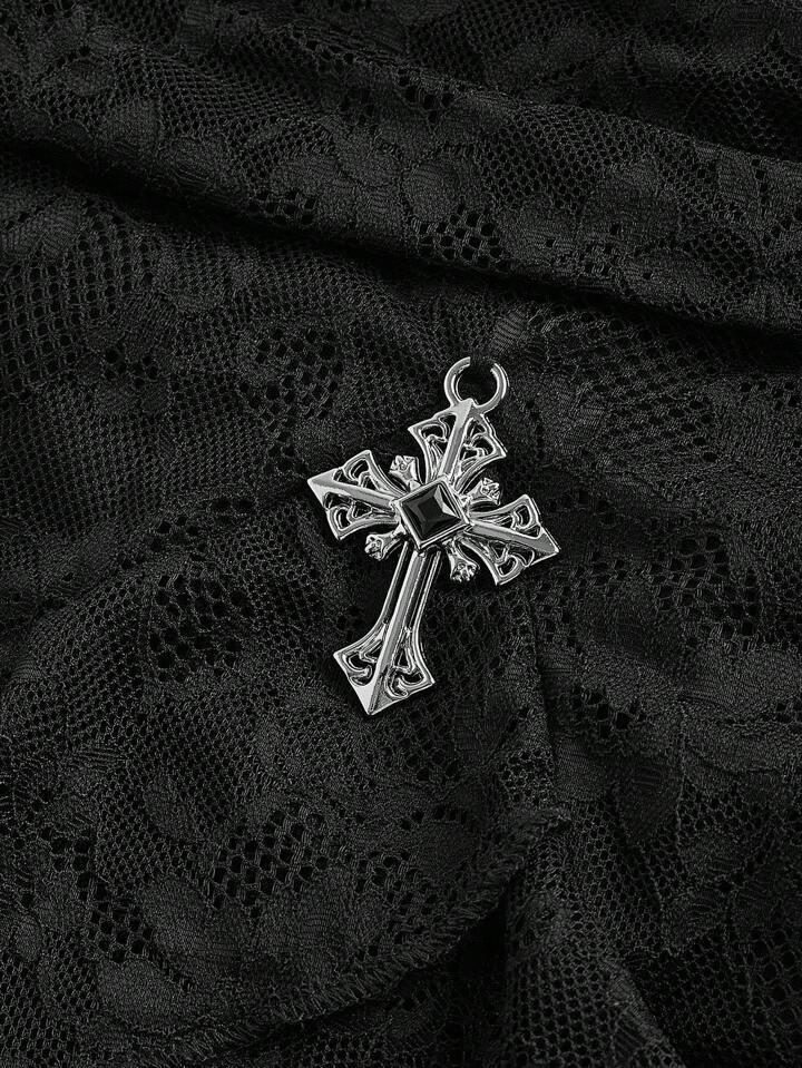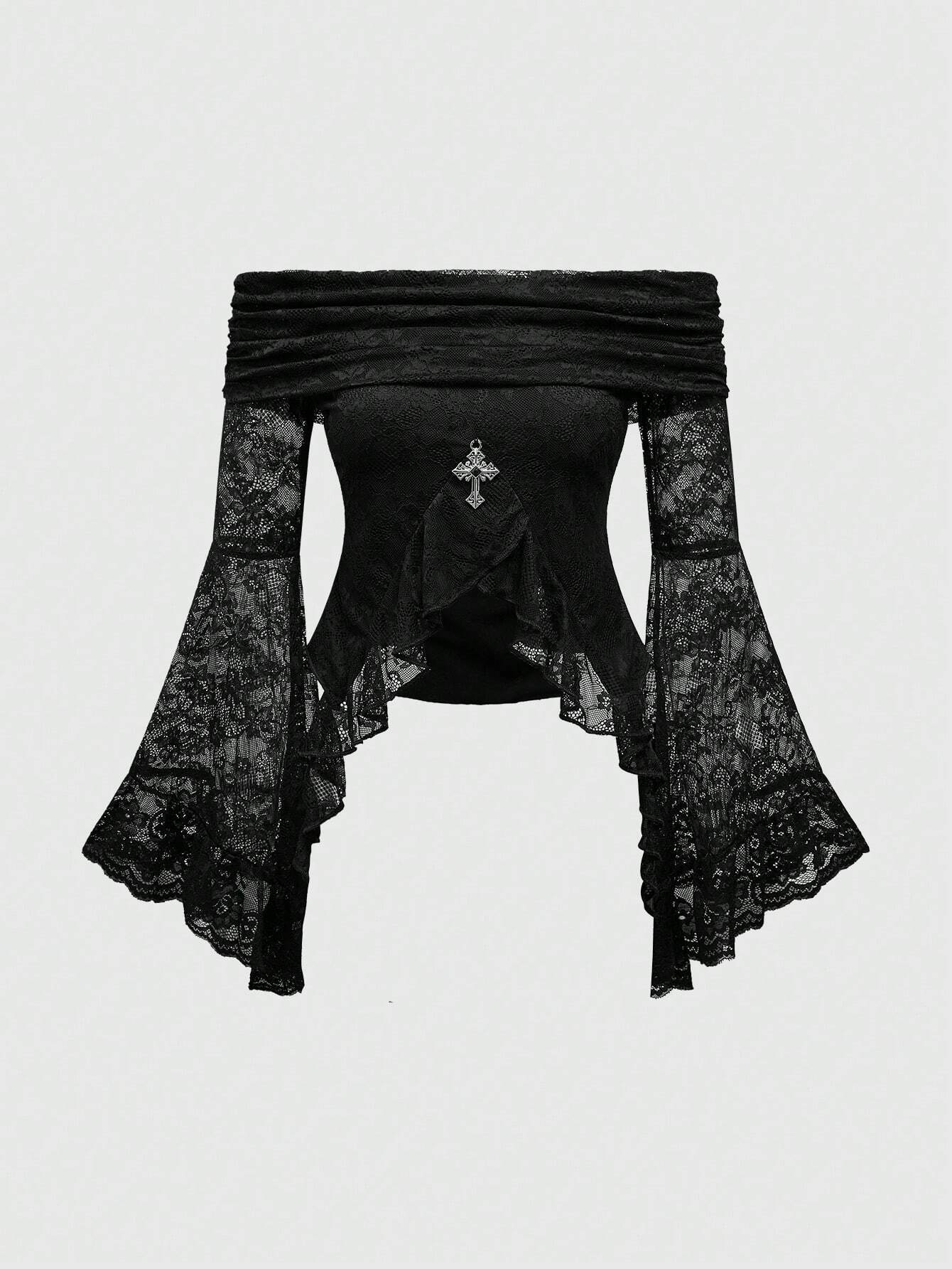Gothic Palace Style Cross Decor Contrast Lace Bell Sleeve Off Shoulder Velvet Blouse For Women