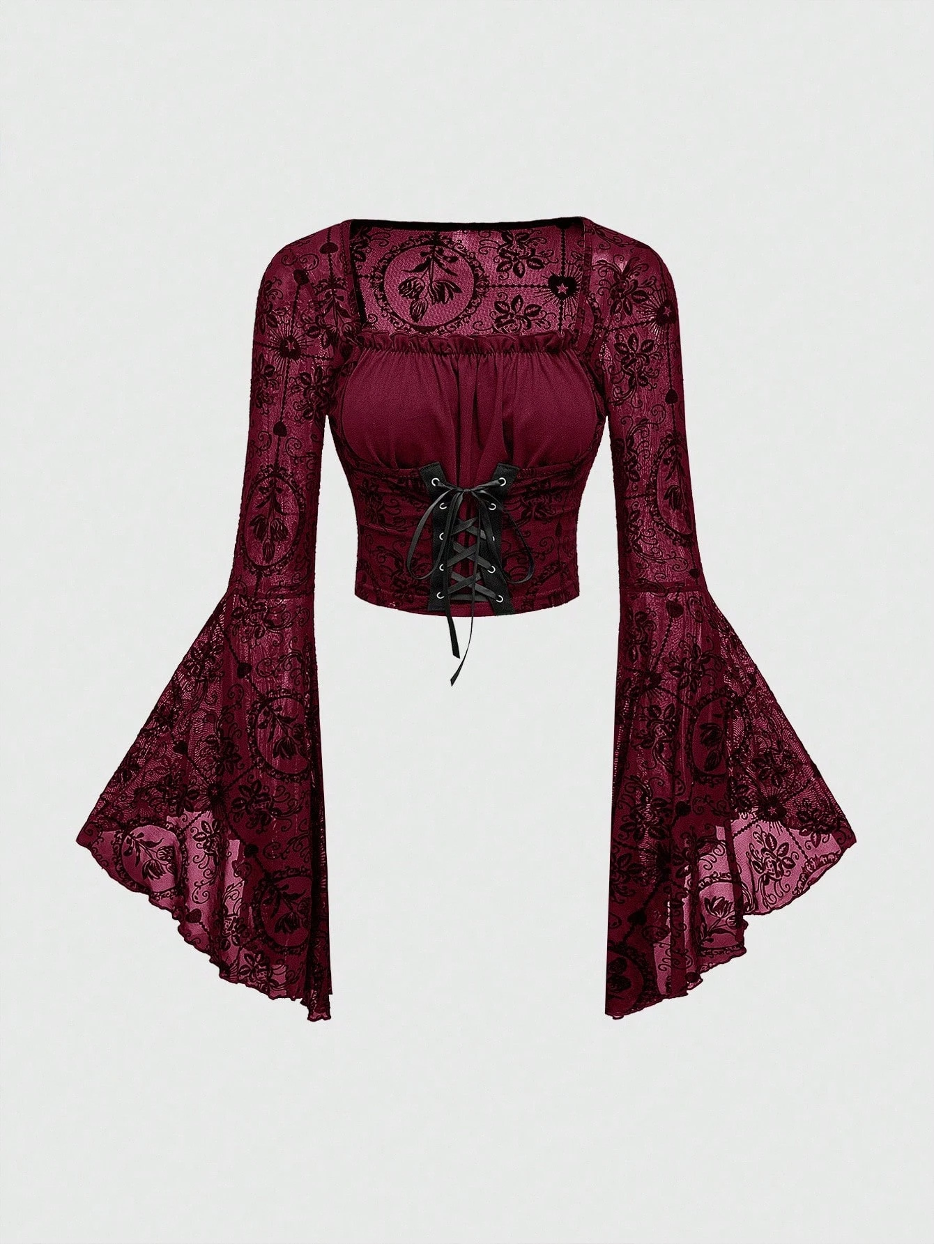 Goth Gothic Palace Style Halloween Party Flocked Cross Floral Mesh Patchwork Lace-Up Waist Women Blouse