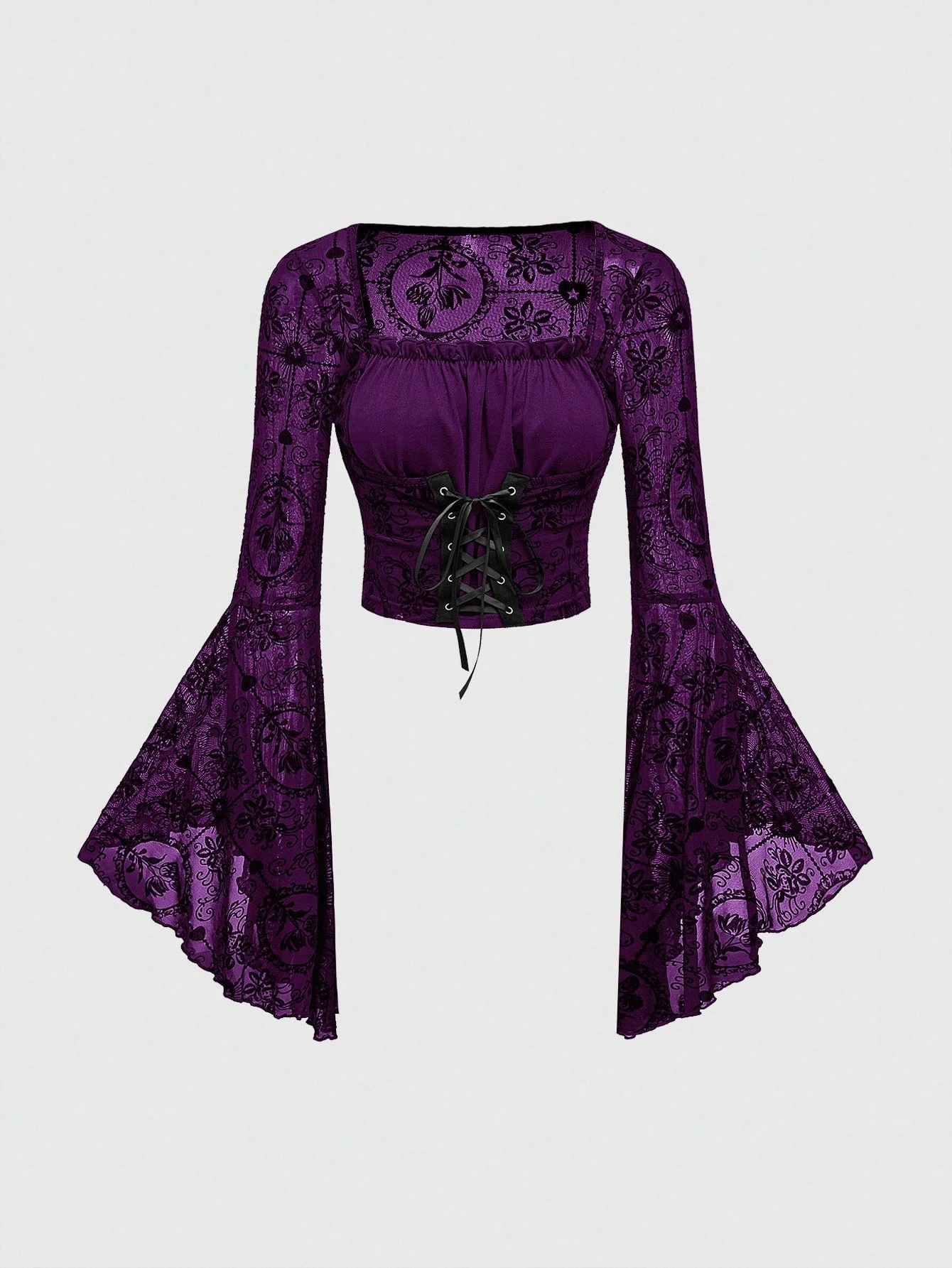 Goth Gothic Palace Style Halloween Party Flocked Cross Floral Pattern Mesh Patchwork Lace-Up Waist Women Blouse