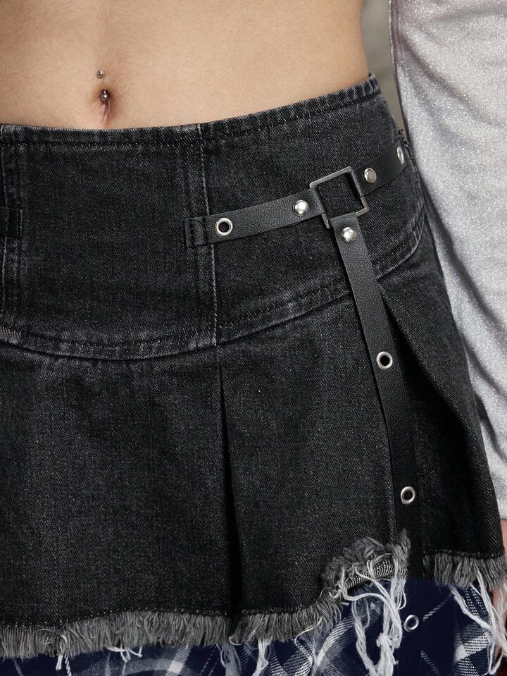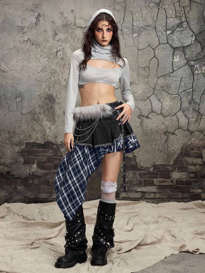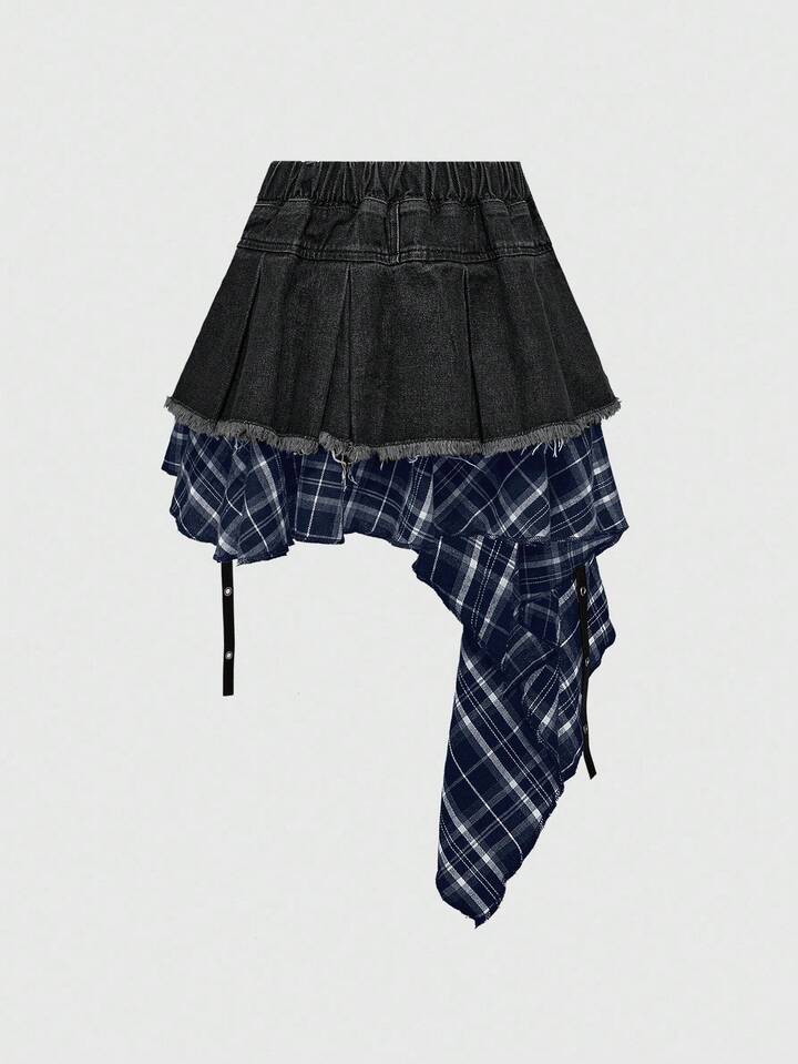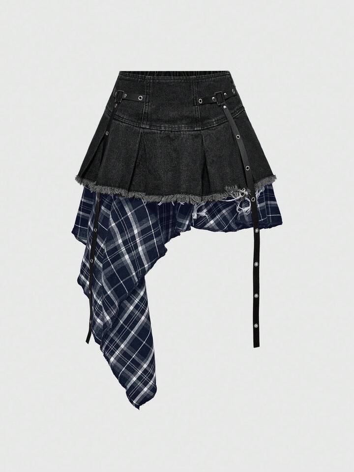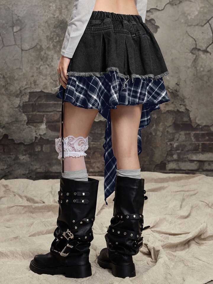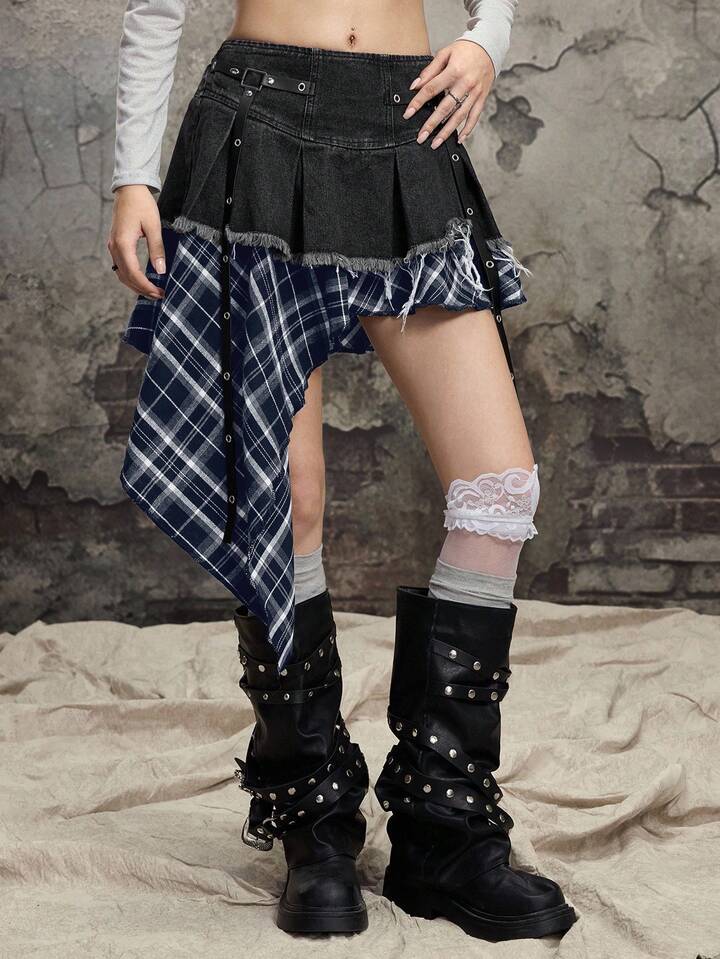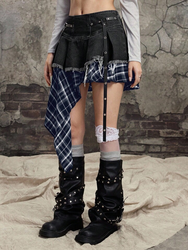 Gothic Patchwork Plaid Asymmetrical Hem Denim Mini Skirt