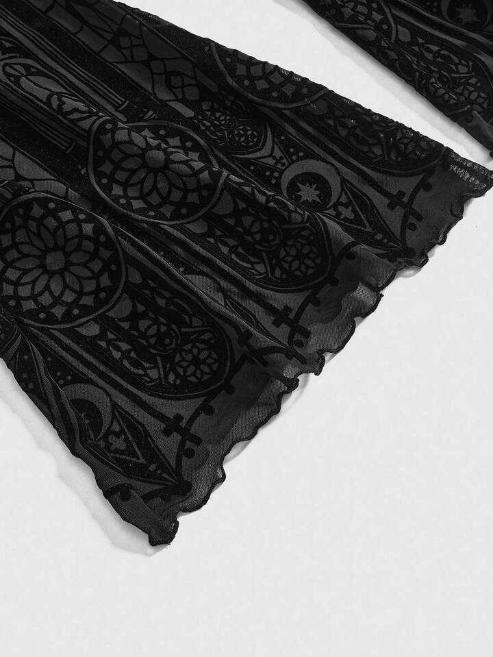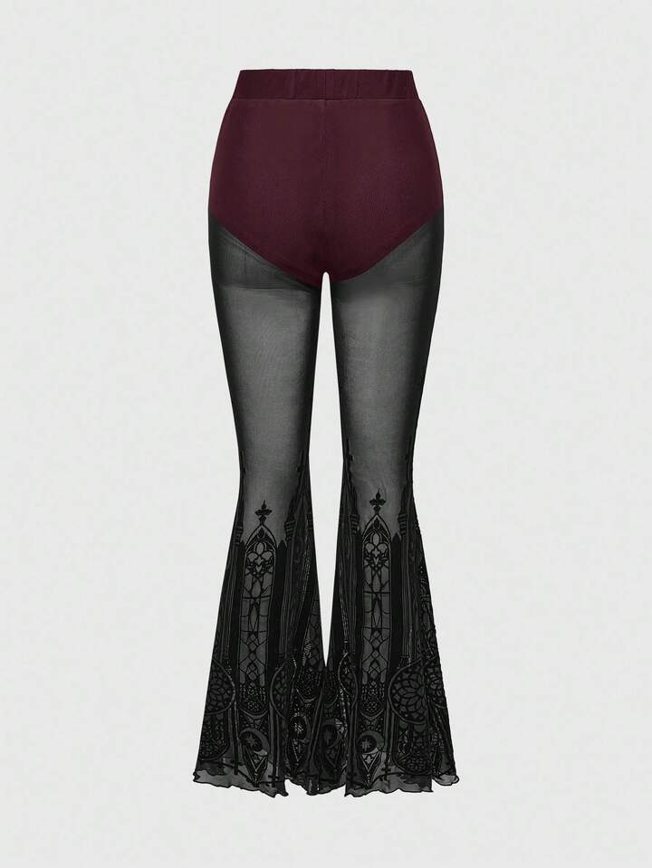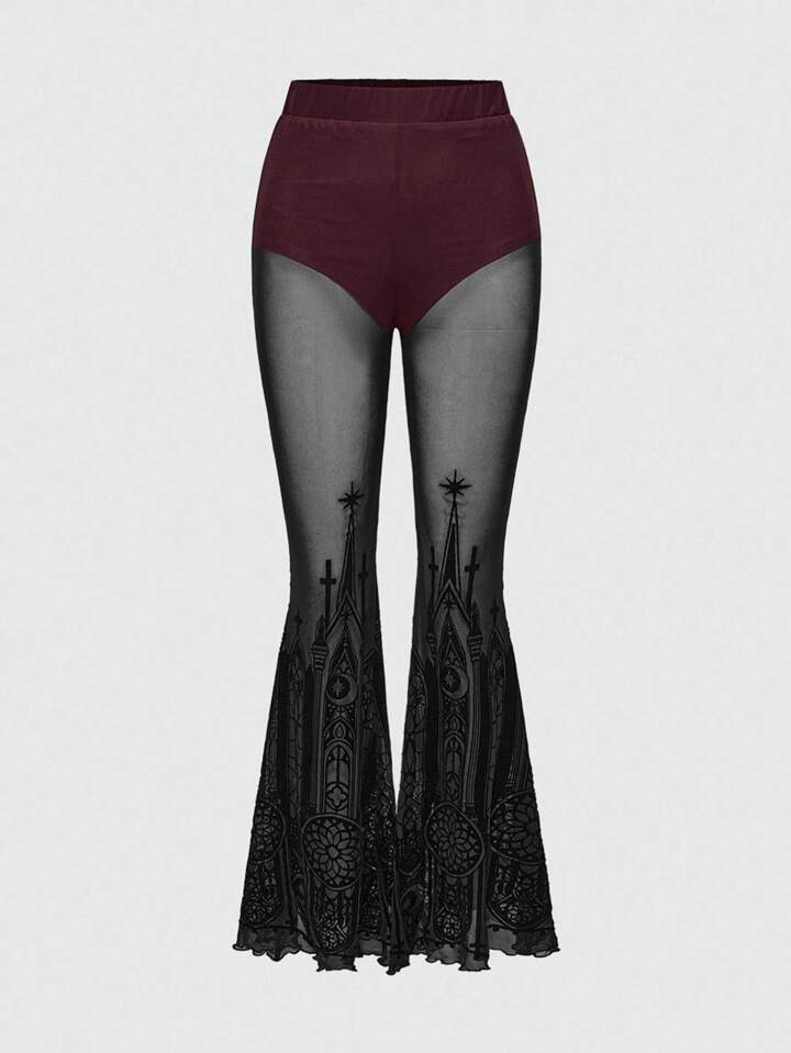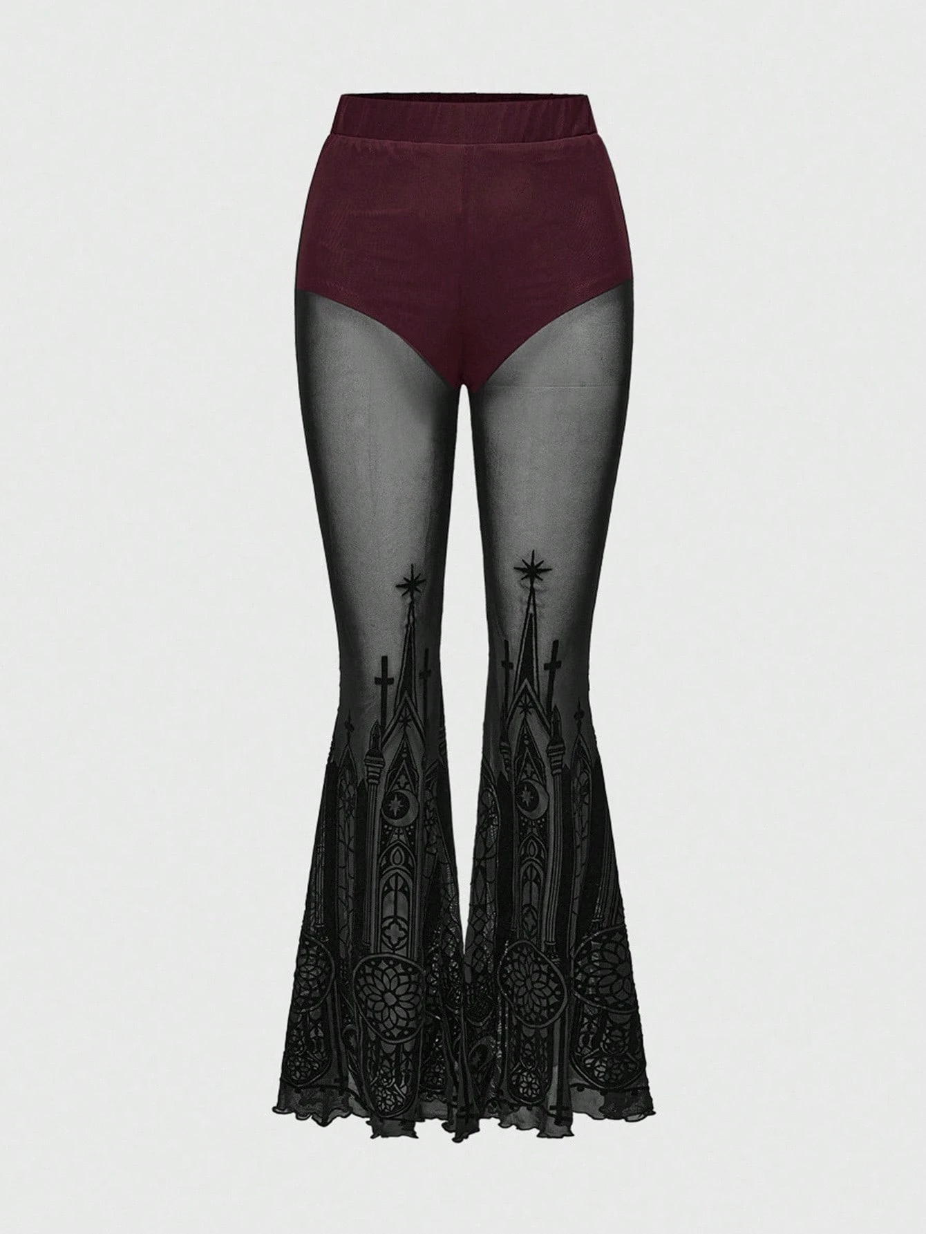 Gothic Retro Castle Flocked Print Sheer Women's Flare Pants