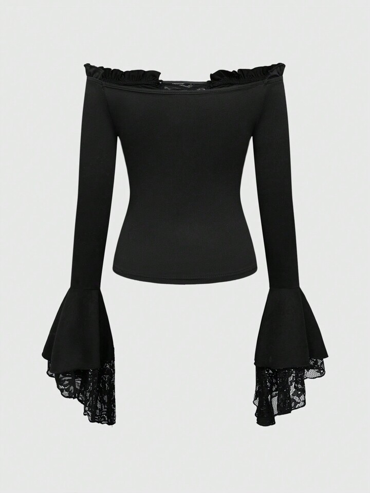 Gothic Royal Style Halloween Party V-Neck Lace Applique Decor Fitted Flare Sleeve Crop Top