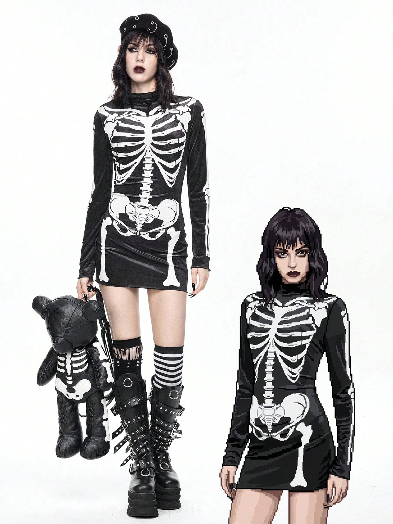 Gothic Skeleton Print Black Velvet Mini Dress For Women