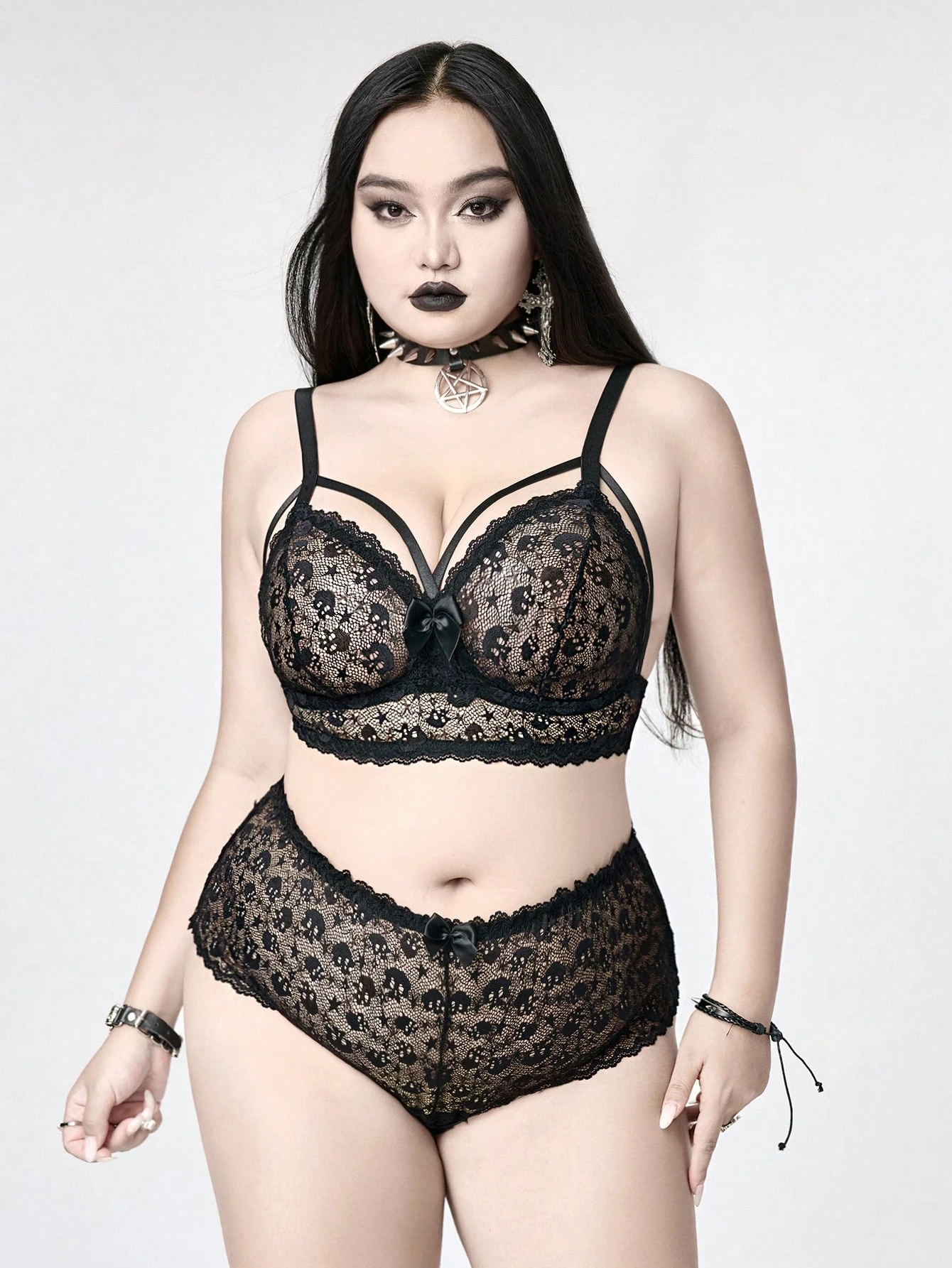 Gothic Skull & Star Lace See-Through Underwire Plus Size Lingerie Set