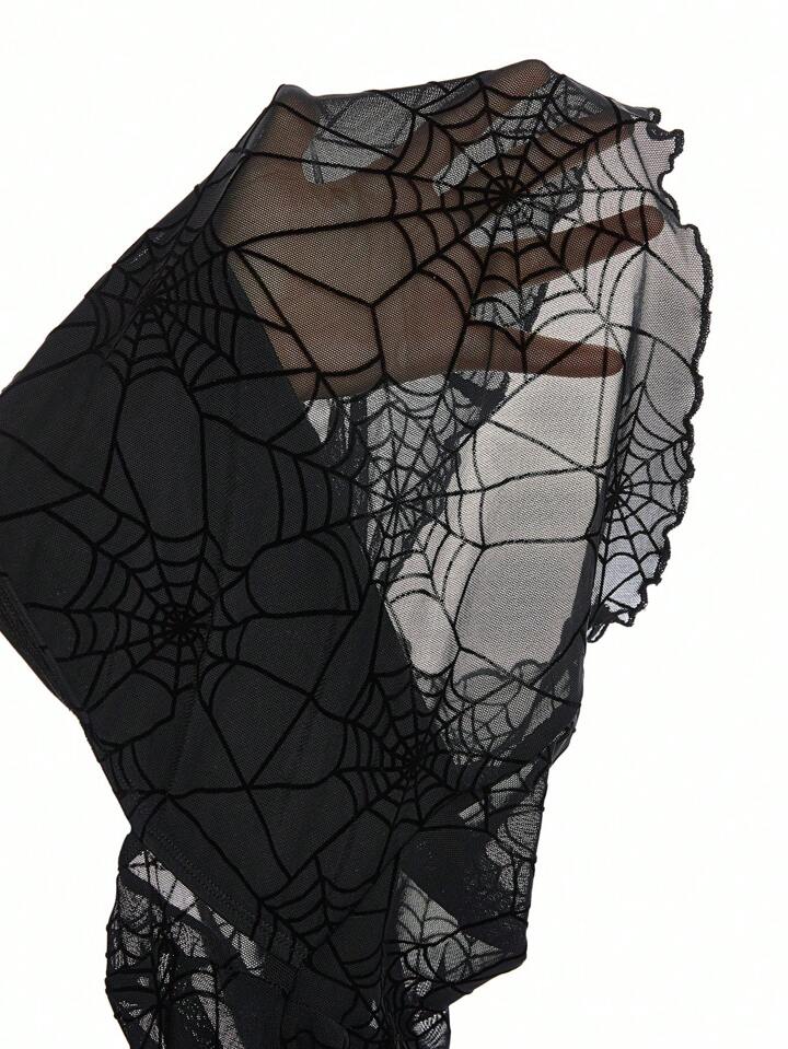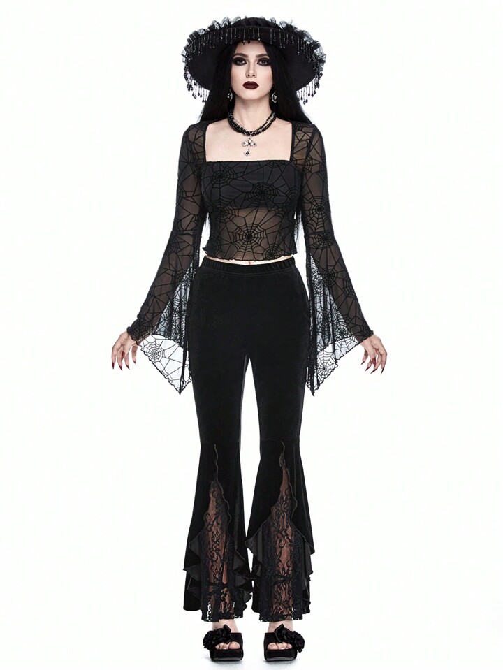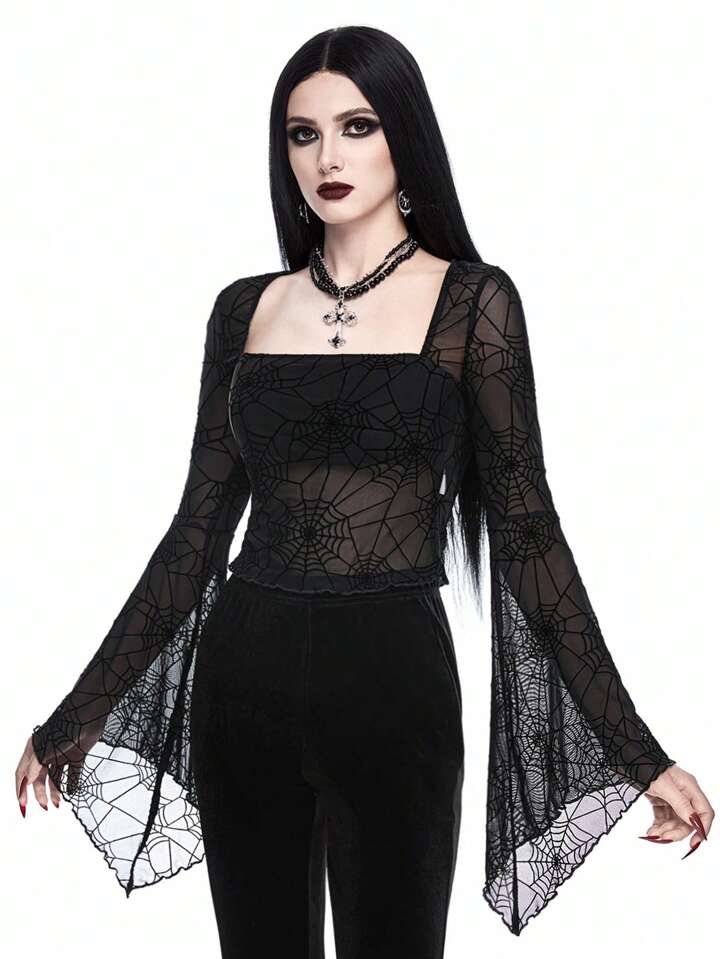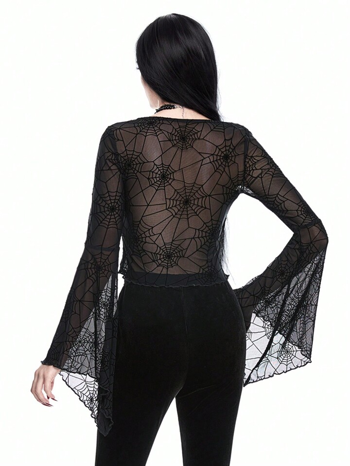 Gothic Spider Web Flare Sleeve High Neck Crop Top With Cinched Waist, For Christmas