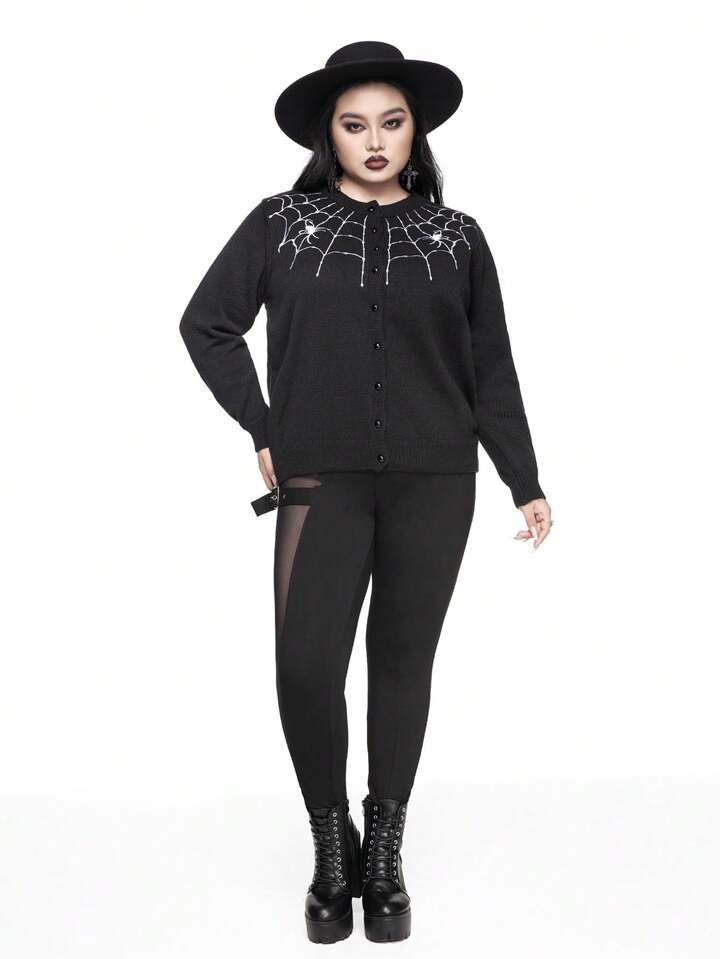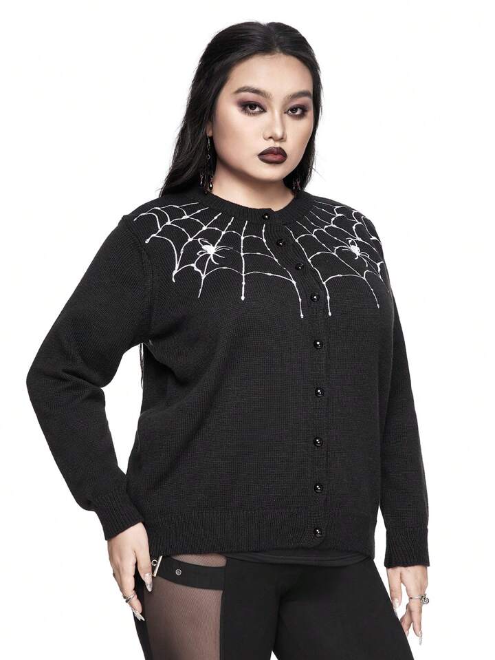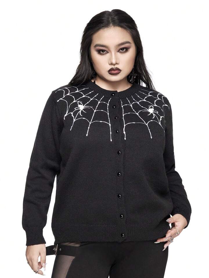 Gothic Spiderweb Embroidery Plus Size Women Knitted Cardigan, Autumn/Winter