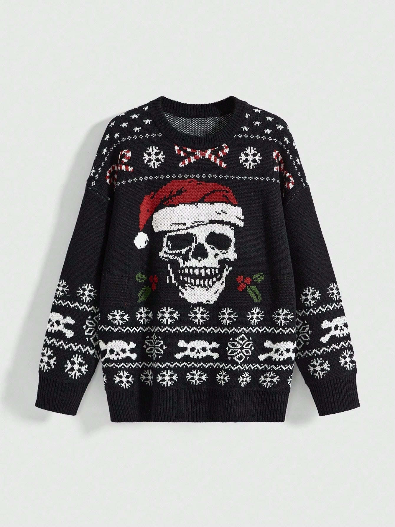 Goth Gothic Style Christmas Skull Santa Hat Loose Fit Pullover Sweater