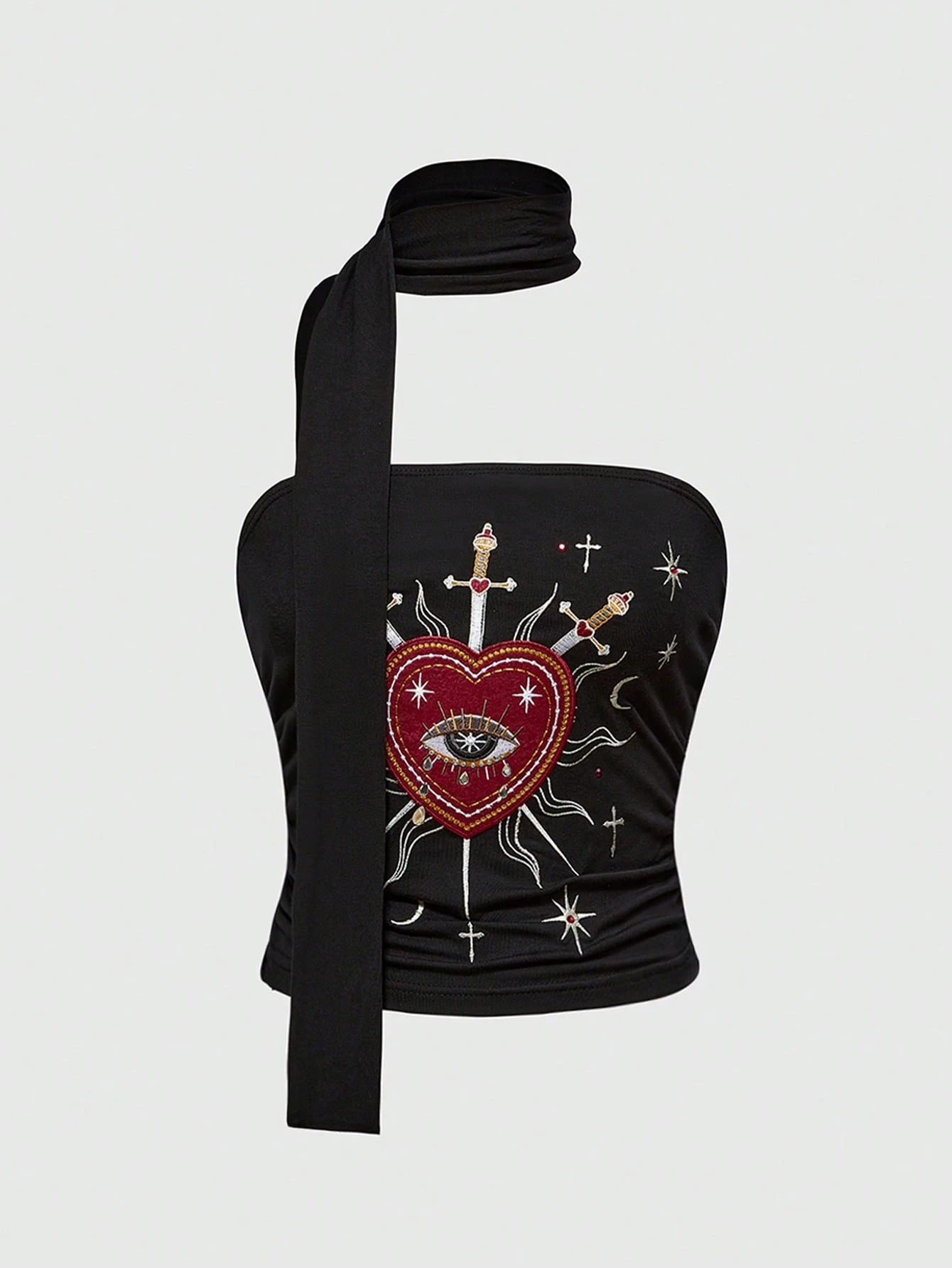 Hippie Gothic Style Embroidered Heart, Rhinestone, Crystal Teardrop & Star Studded Lace-Up Short Women Top