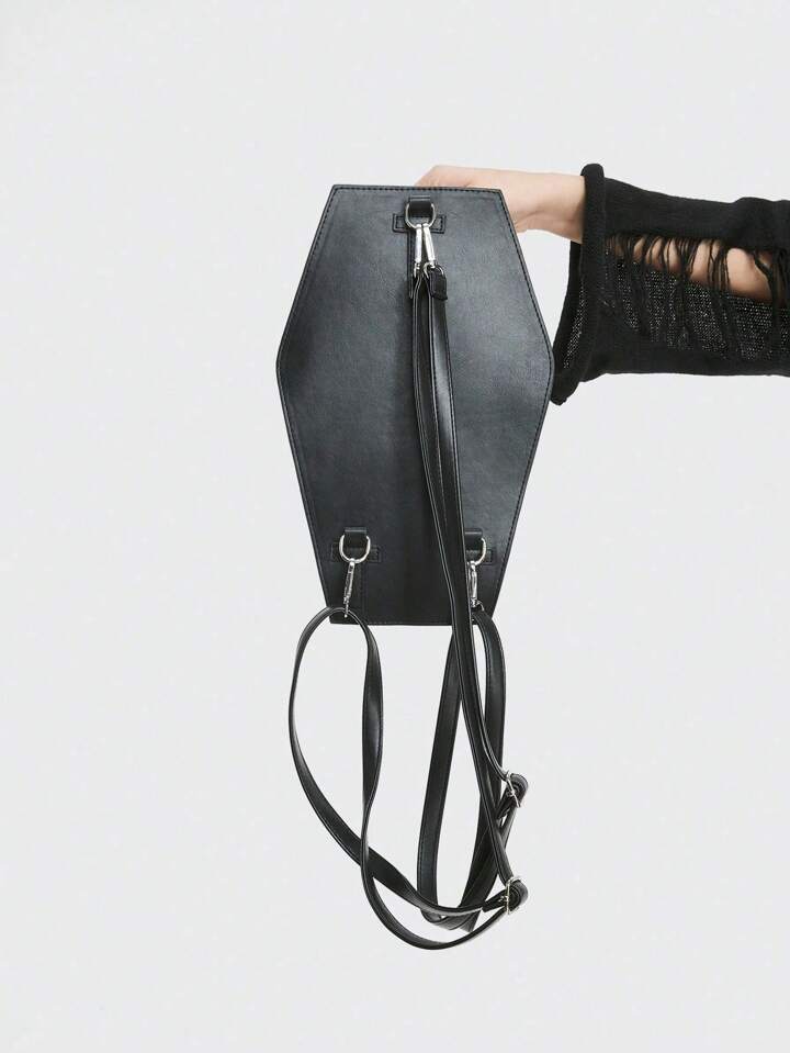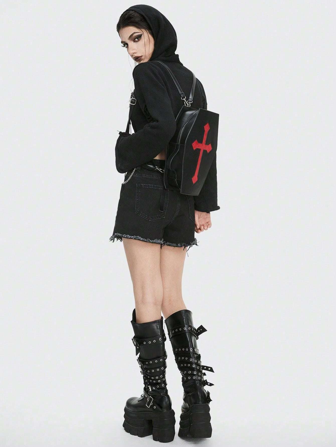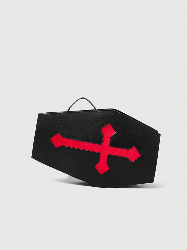Gothic Style Red Velvet Cross Patchwork Multi-Functional Coffin-Shaped Handheld Shoulder Black Backpack, Suitable For School