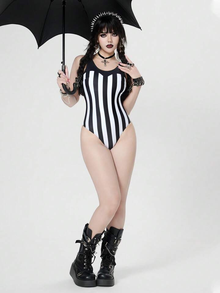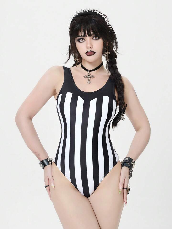 Gothic Style Vampire Striped One-Piece Swimsuit For Women, Halloween