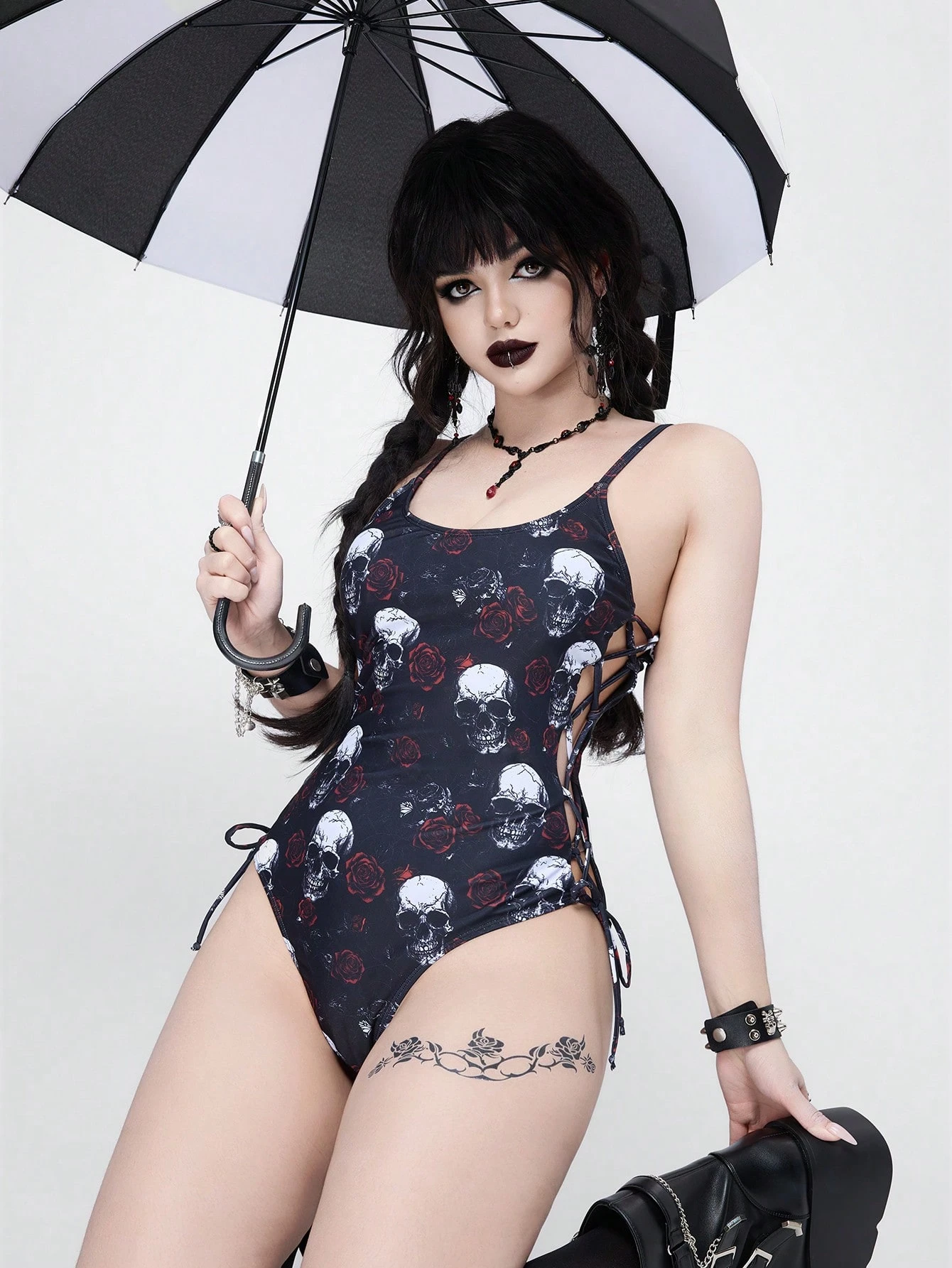Goth Gothic Thorny Rose & Skull Print Adjustable Drawstring One Piece Swimsuit For Women, Halloween