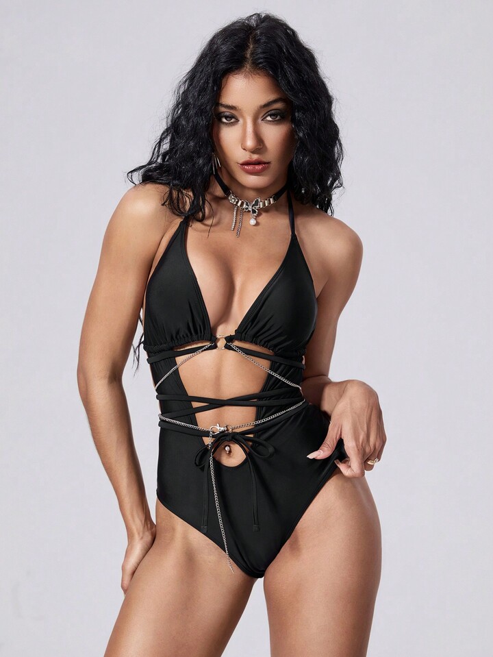 Gothic Twist-Tie One-Piece Swimsuit, For Summer Beach Vacation