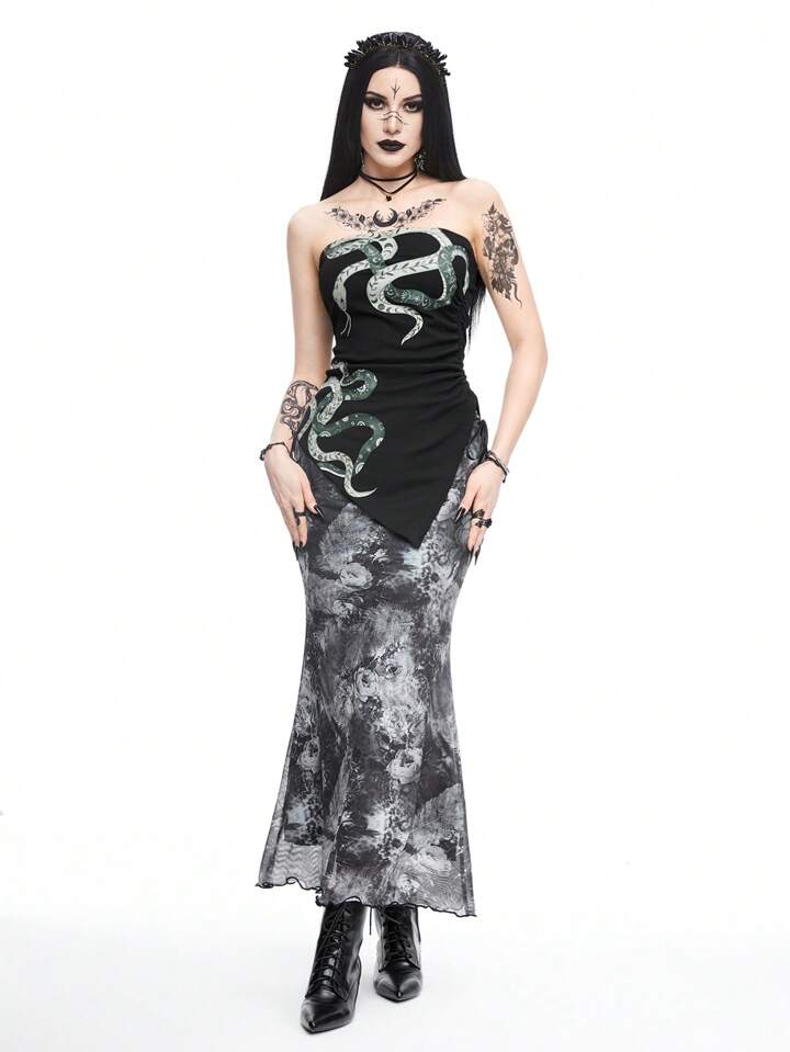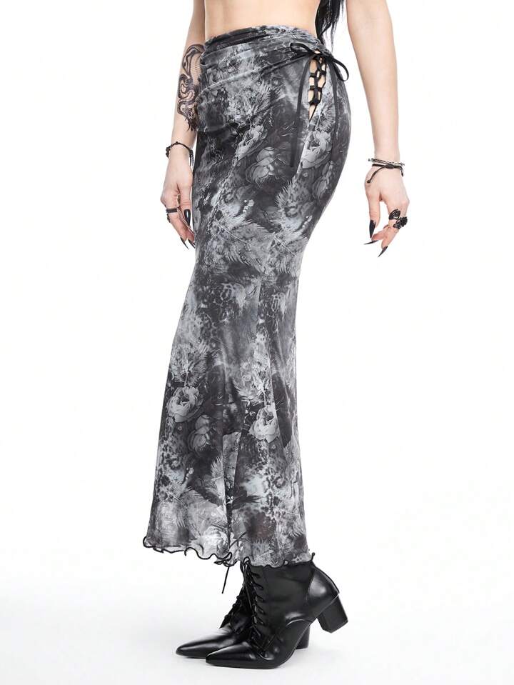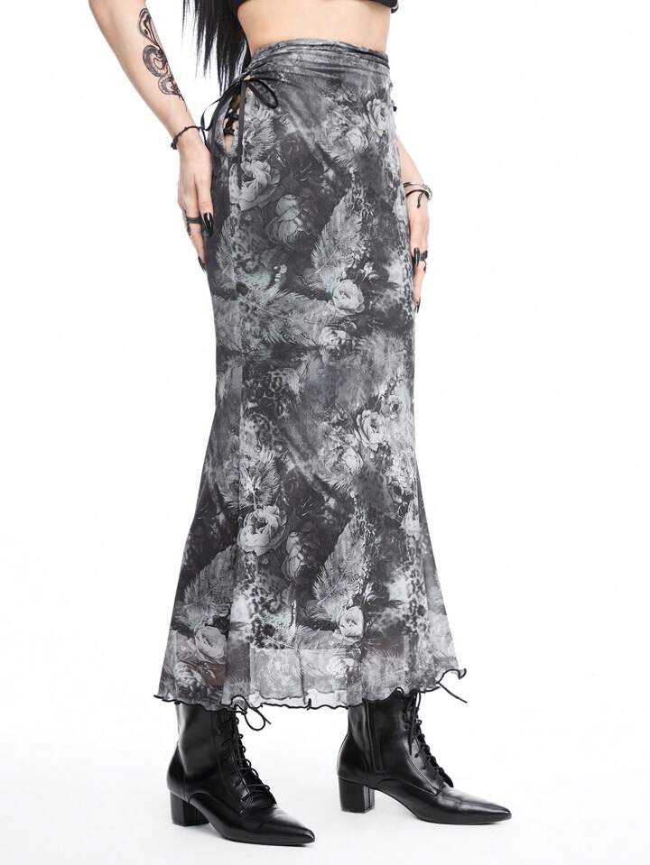 Gothic Vacation Style Leopard Floral Dark Sheer Mesh Printed Skirt With Hollow-Out Design And Tie On Both Sides, Mermaid Hem Midi Skirt