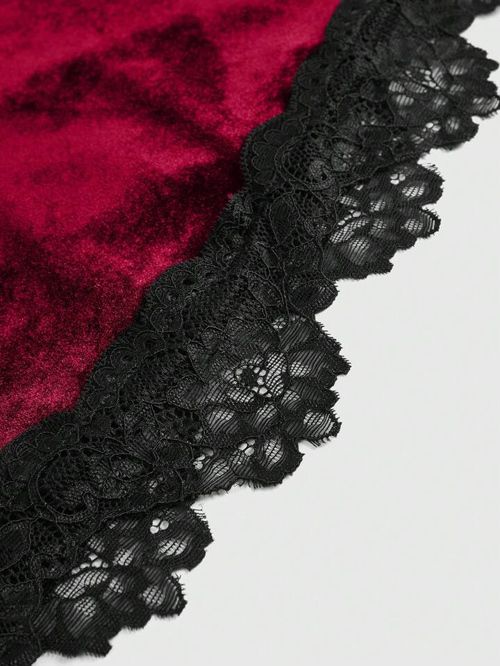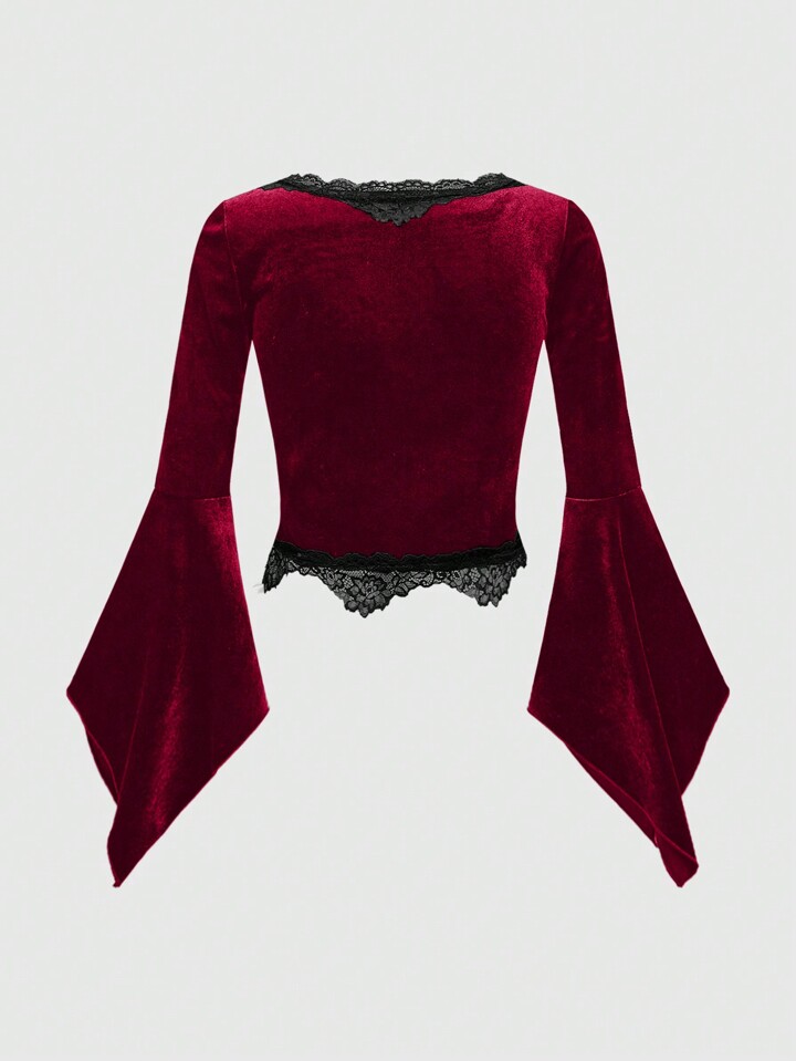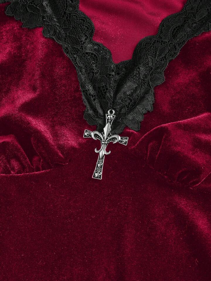 Gothic Velvet & Lace Panel Sexy Romantic V Neck Cross Metal Pendant Flare Sleeve Women Top