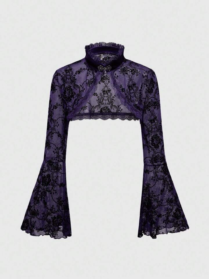 Gothic Versatile Slit Flare Sleeve Women Retro Flocked Floral Cardigan