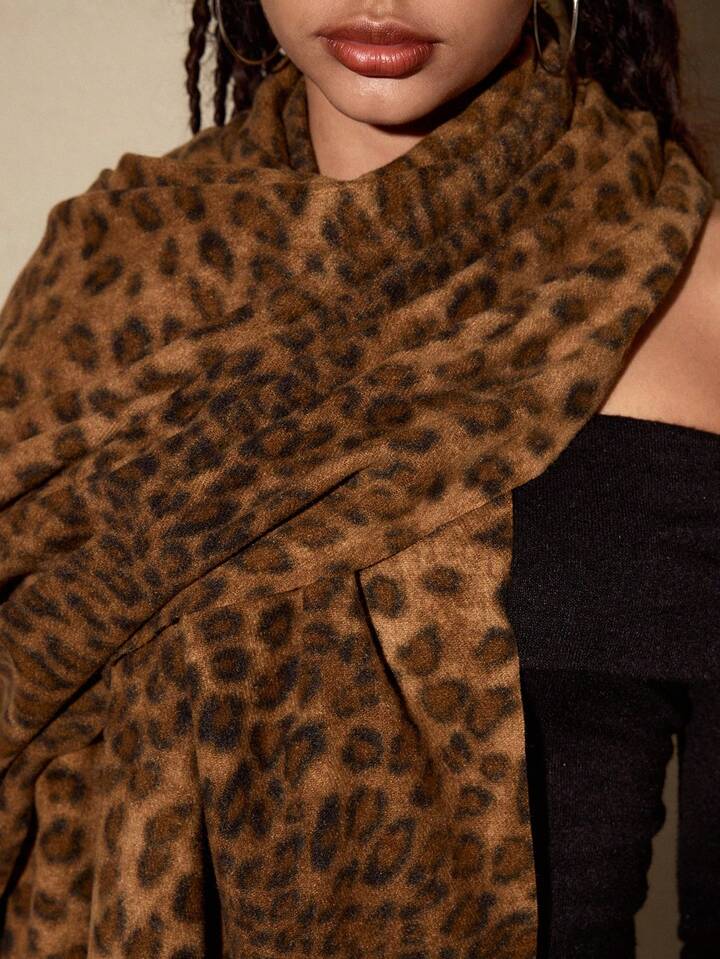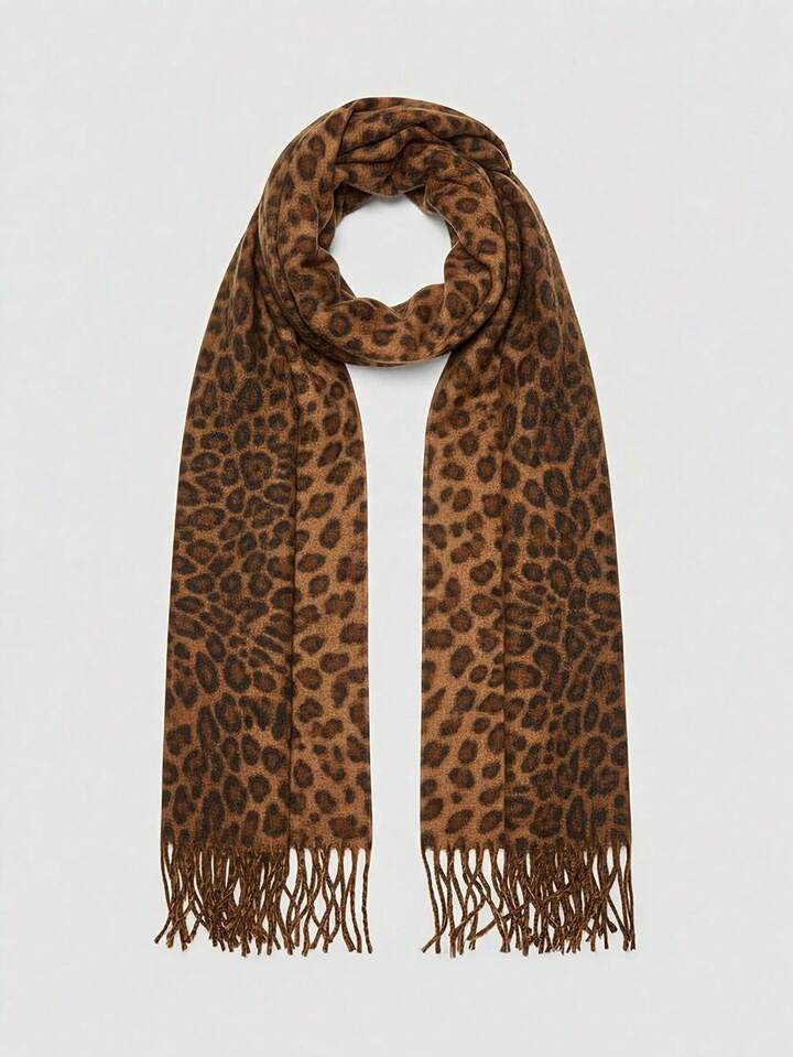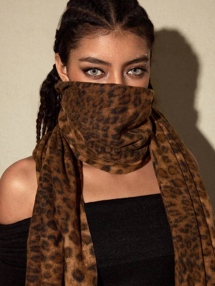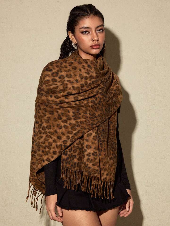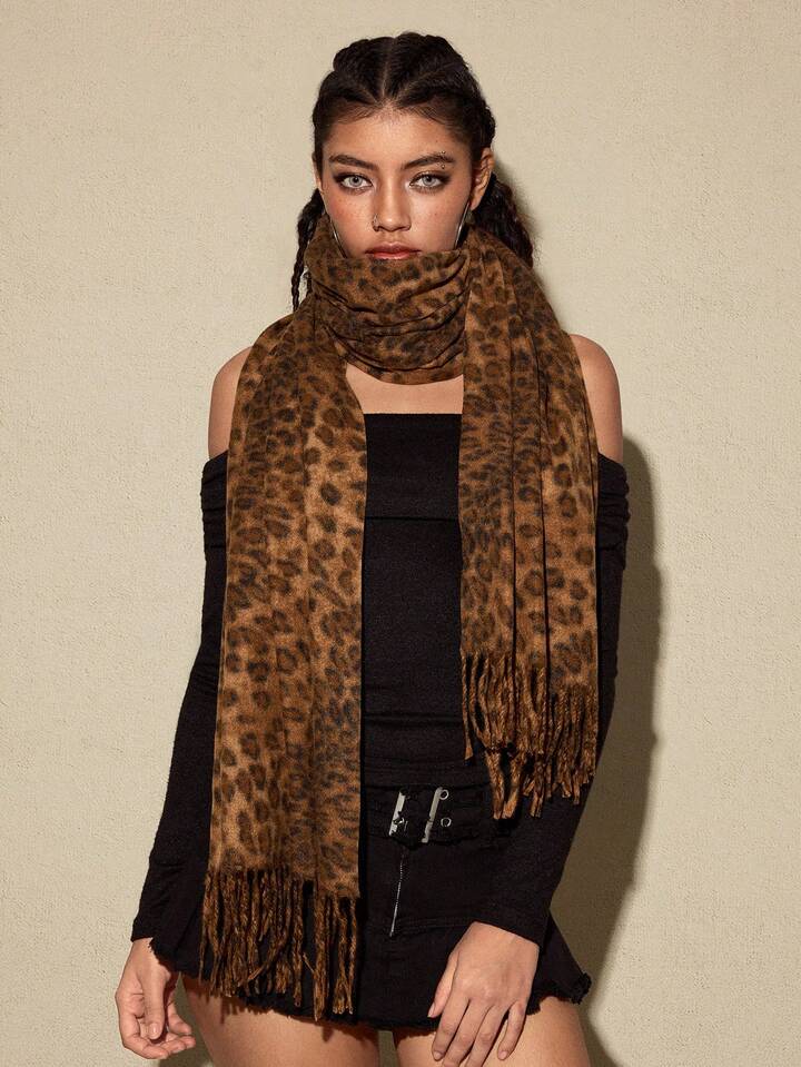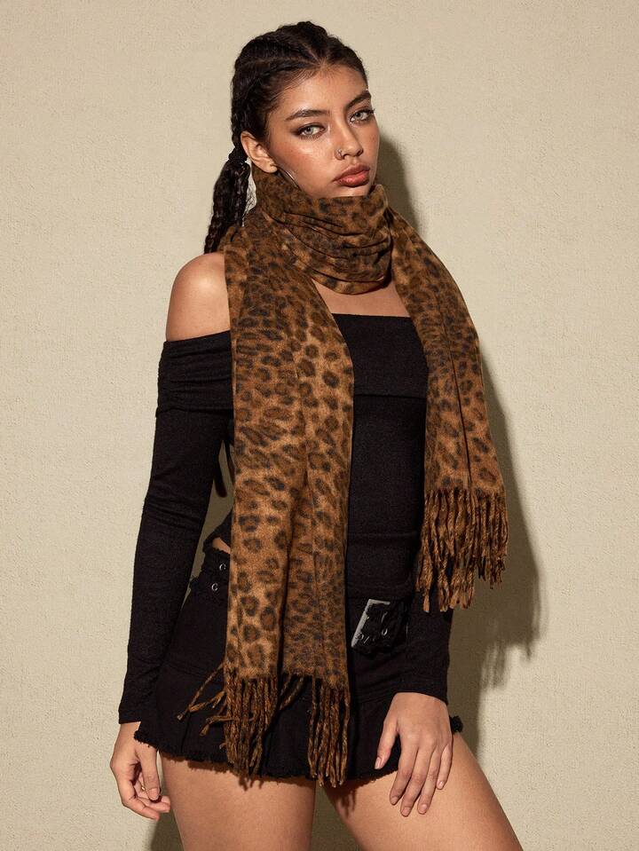 Grunge Punk 1 Leopard Print Pattern Plush Scarf, Y2K Thick Warm Square Fringed Scarf, Suitable For Daily Matching With Autumn And Winter Scarves