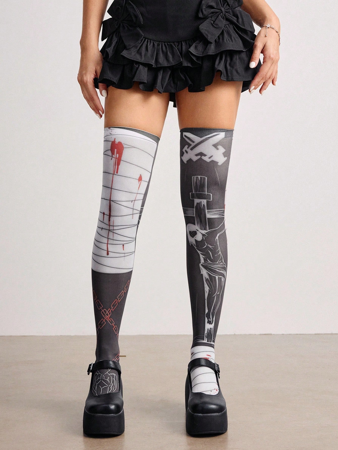 Grunge Punk 1 Pair Punk Style Contrast Color Cross & Chain Print Over-The-Knee Socks, Anime Cosplay Socks For Women