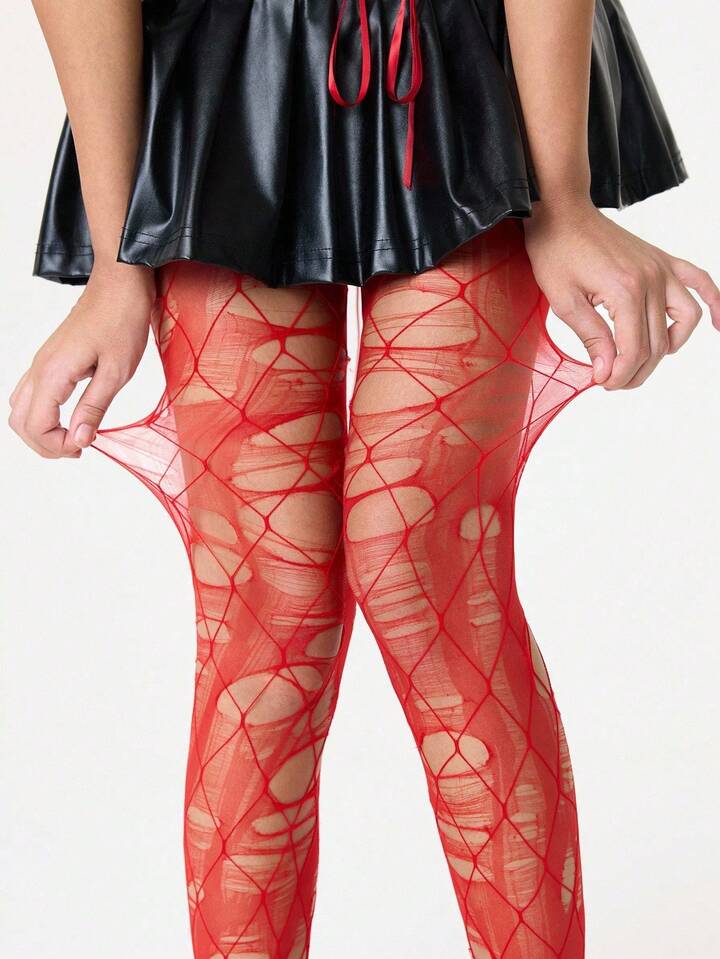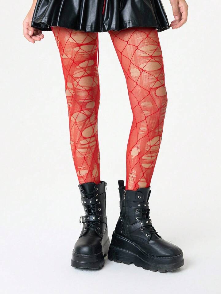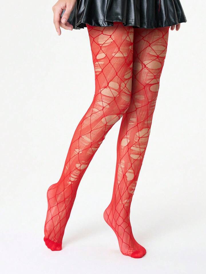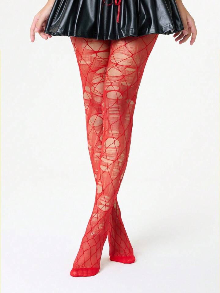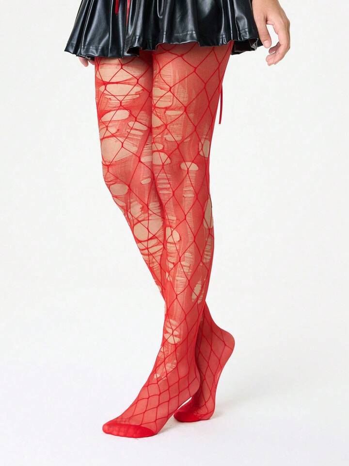 Grunge Punk 1 Pair Red Solid Color Fishnet Socks + 1 Pair Red Stockings, Y2K Baddie Style Set, Suitable For Daily Street Wear