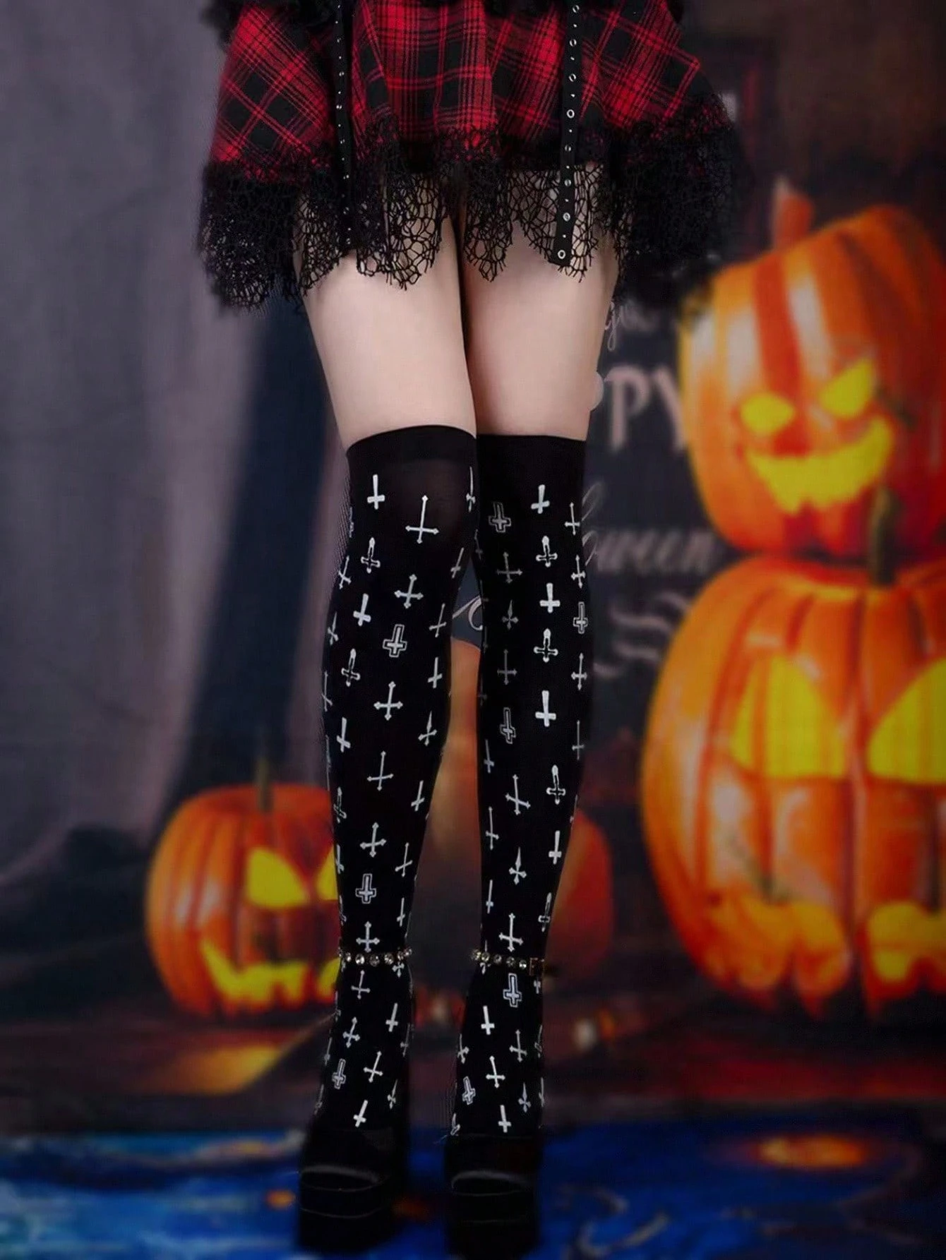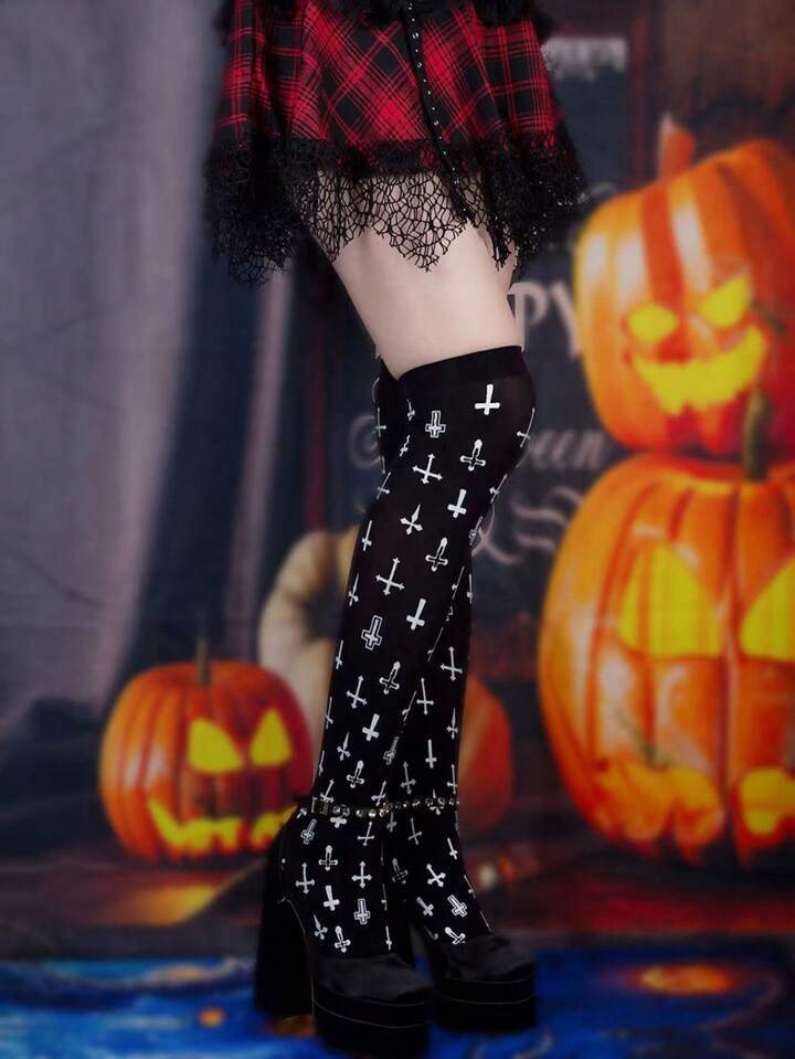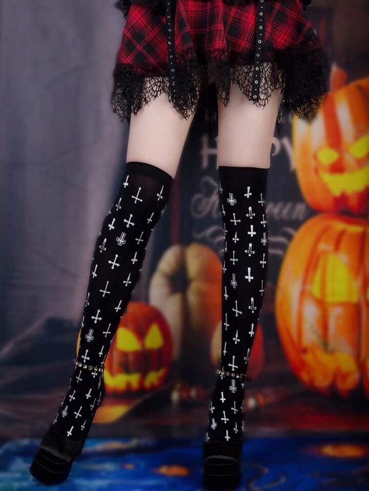 Grunge Punk 1 Pair Women's Cross Print Over-The-Knee Socks, Suitable For Pairing With Mini Skirts For Halloween