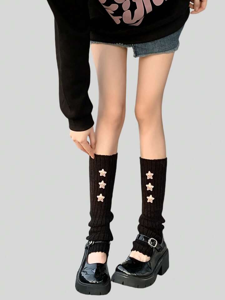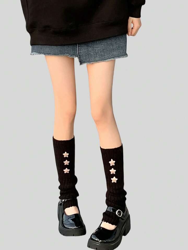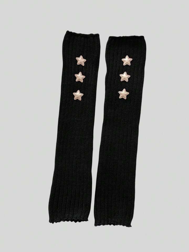 Grunge Punk 1 Pair Women's Leg Warmer Leg Warmers, Solid Color Overlaid Leg Warmers, Warm Knitted Black Leg Warmers/Stockings For Autumn/Winter, Y2K Style Stacked Leg Warmers With Cute Star Decor, Long White Knee-High Leg Warmers, Suitable For Daily Wear, Dates, Home, And Outings