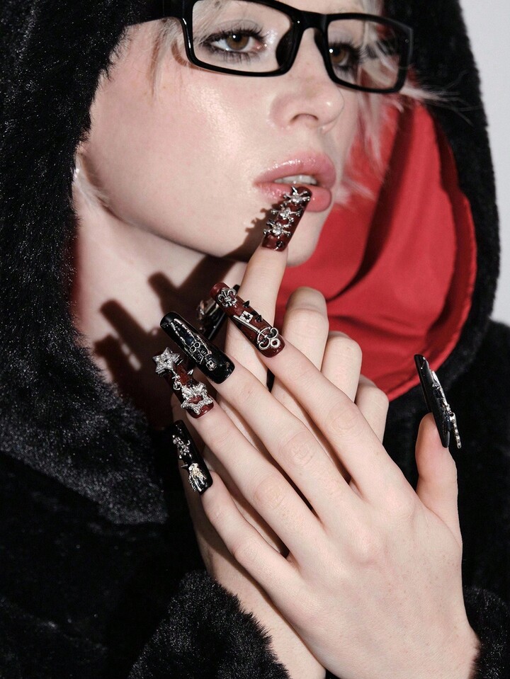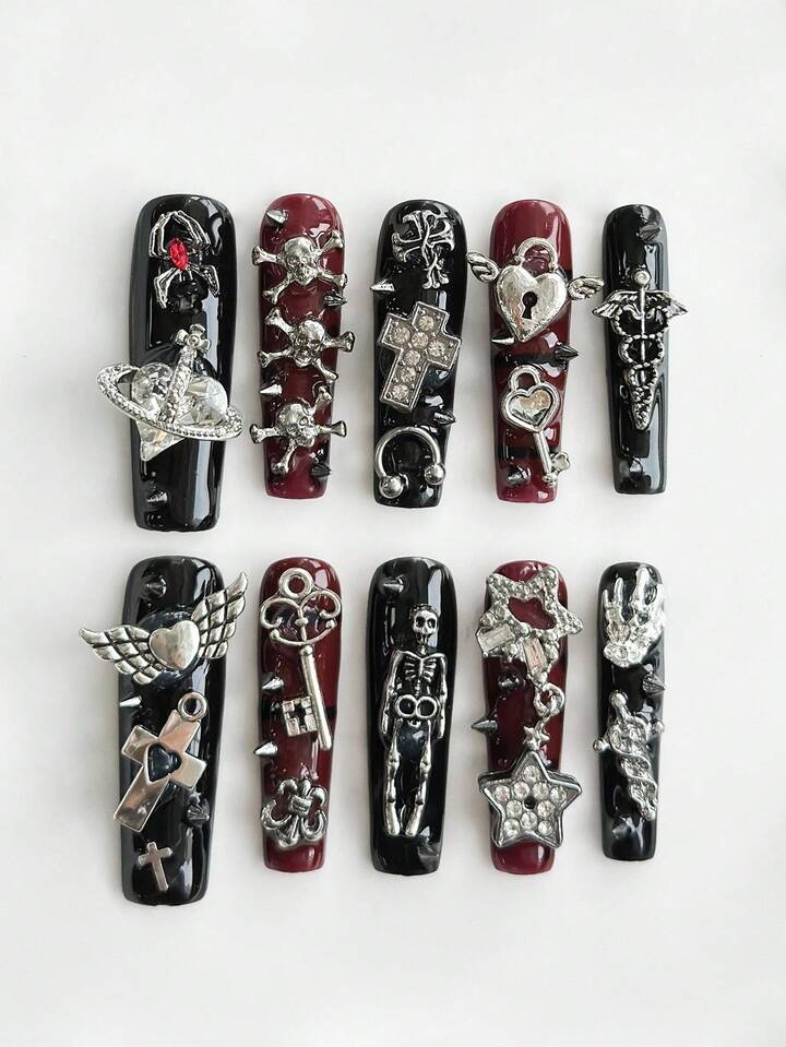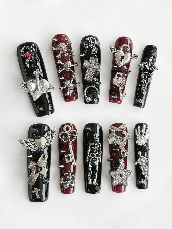 Grunge Punk 10pcs Black & Red Goth Style Spider, Cross, Heart, Star, Skull Element High Quality Extra Long Handmade False Nails + 3pcs Double-Sided Adhesive, Removable Y2K Punk Bicolor Rhinestone Nail Stickers, Suitable For Holidays, Parties, Dancing And Daily Wear, Halloween