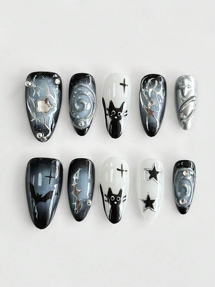 Grunge Punk 10pcs Dark Gothic Bat & Star Pattern High Quality Handmade False Nails + 3pcs Double-Sided Adhesive, Y2K Style Rhinestone Blue & Black Ombre Nail Stickers, Detachable Hand-Painted Black Cat Nail Art Stickers, Suitable For Holidays, Parties, Dancing And Daily Wear