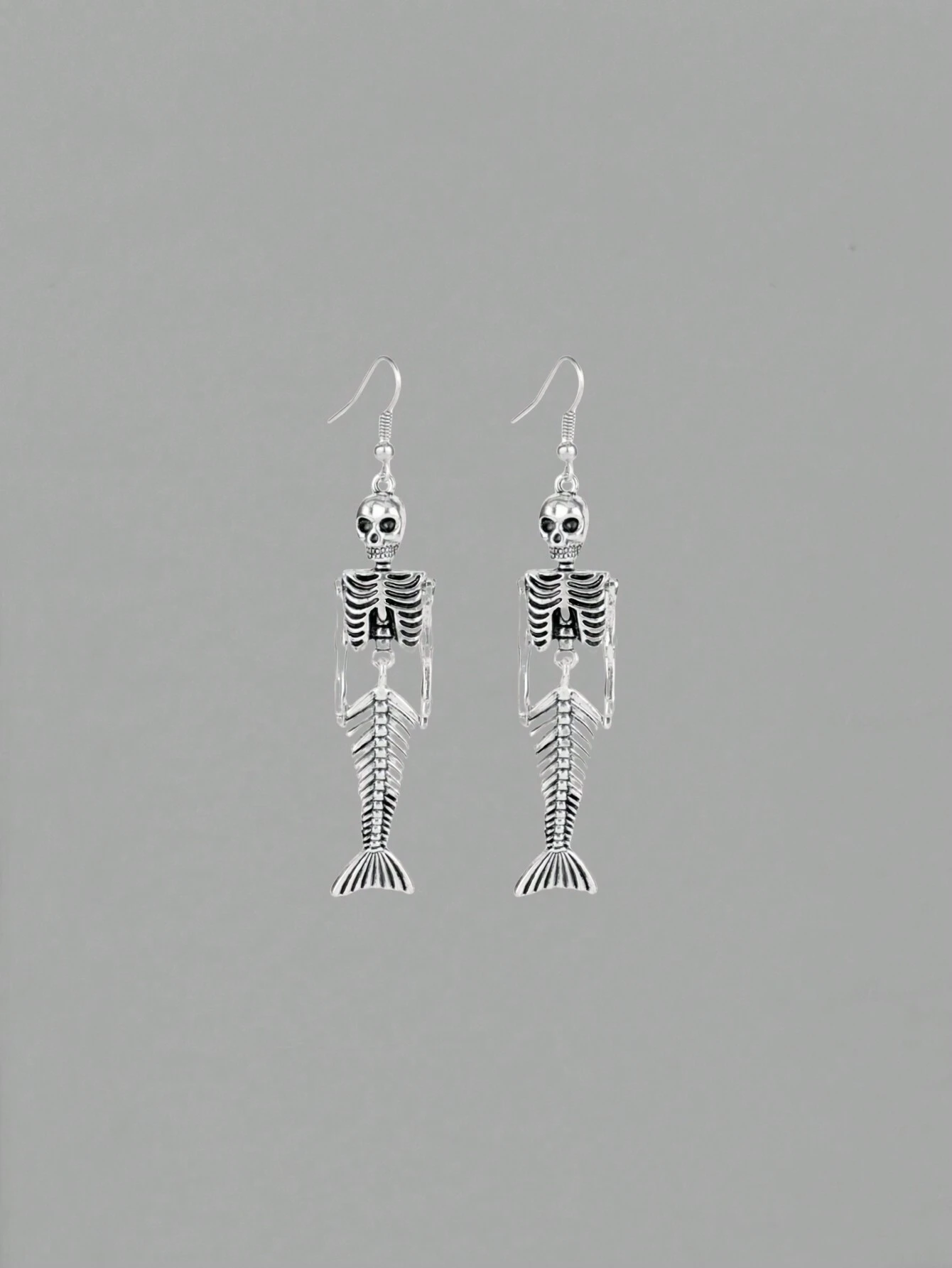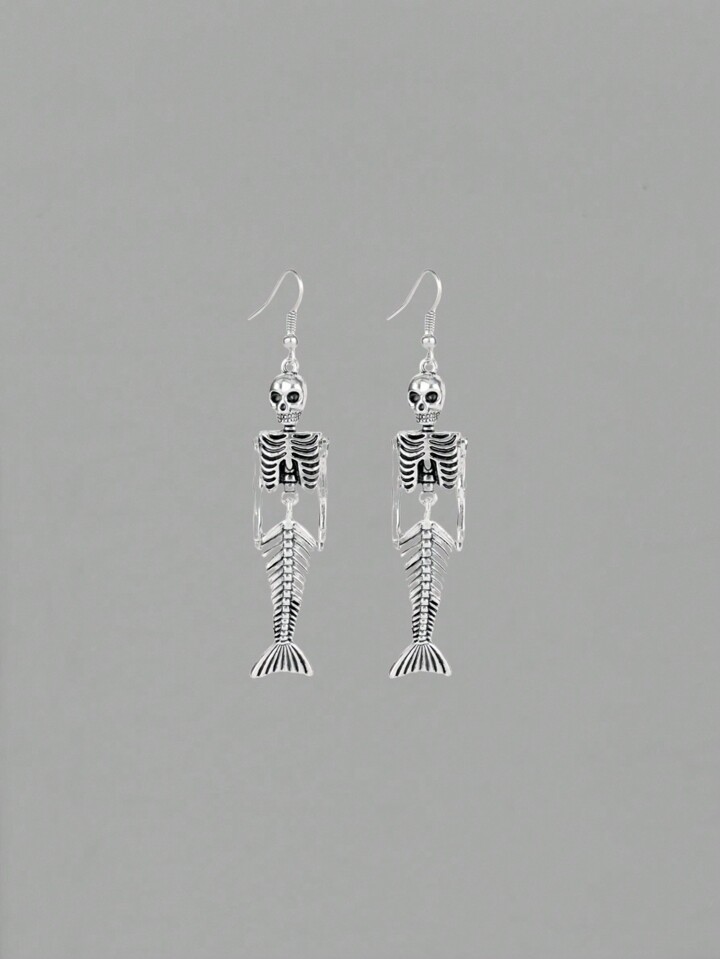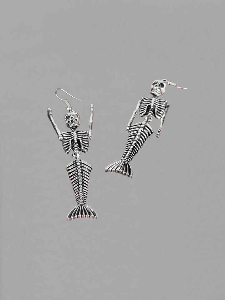 Grunge Punk 1pair Unique Niche Cute Punk Mermaid Skeleton Earrings Silver Jewelry For Women, Suitable For Halloween