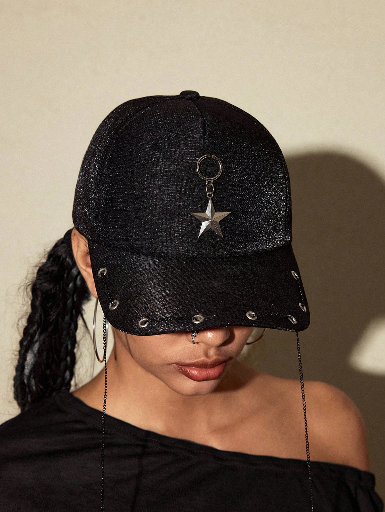 Grunge Punk 1pc Black Y2K Punk Style Metal Chain Star Eyelet Decoration Simple Baseball Cap, Suitable For Sports, Casual Outing, Daily Commute