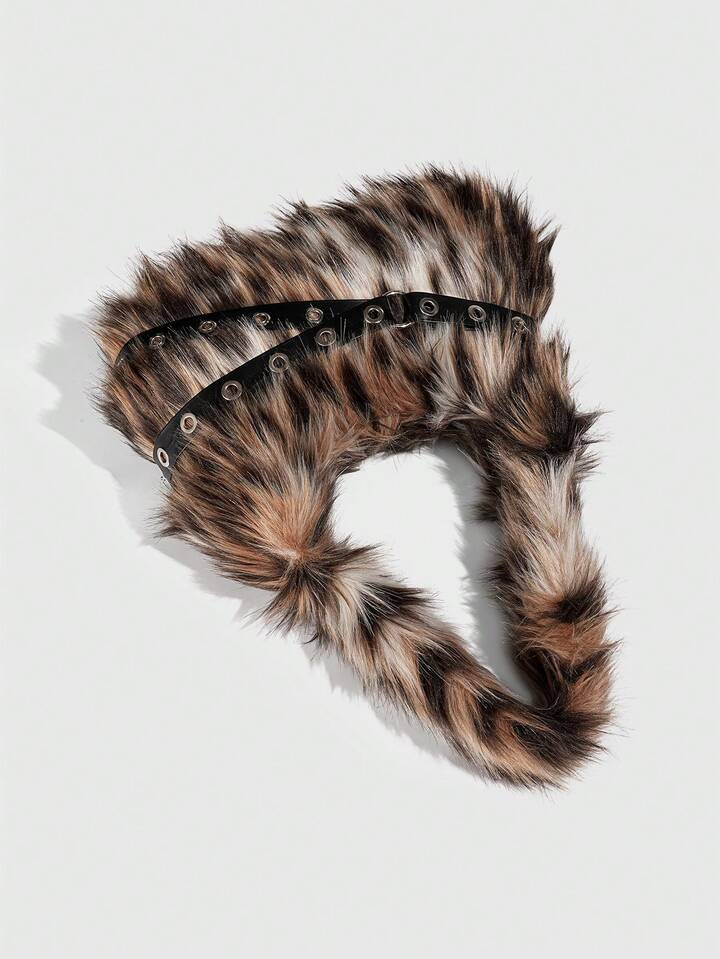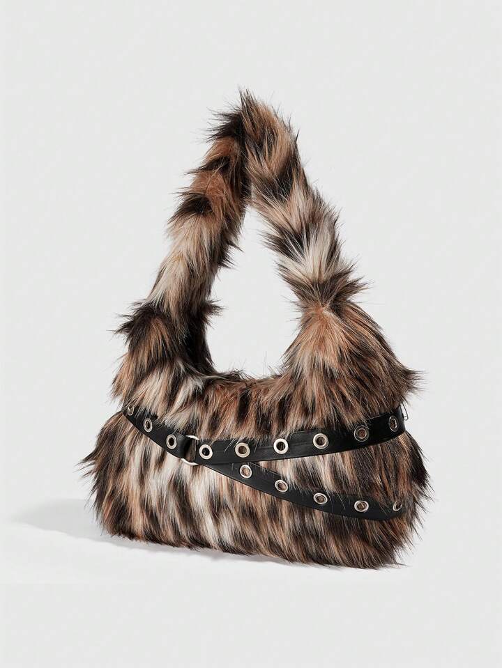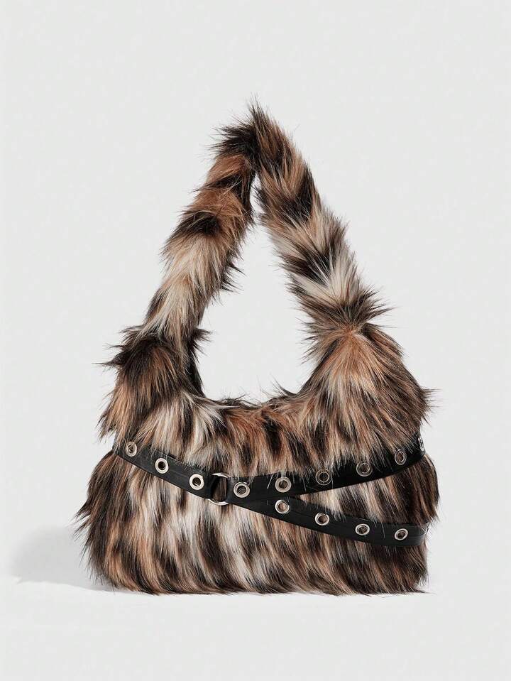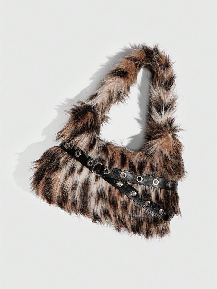 Grunge Punk 1pc Chic Brown Leopard Print Plush Bag For The Underarm Area, A Y2K Edgy Handbag For Ladylike Individuals, A Punk-Inspired Small Bag With PU Leather Decoration, Suitable For Pairing With A Handbag At Parties And Gatherings