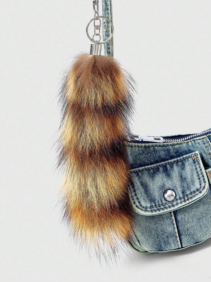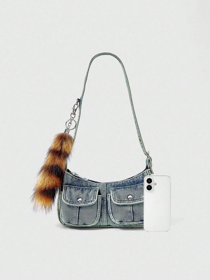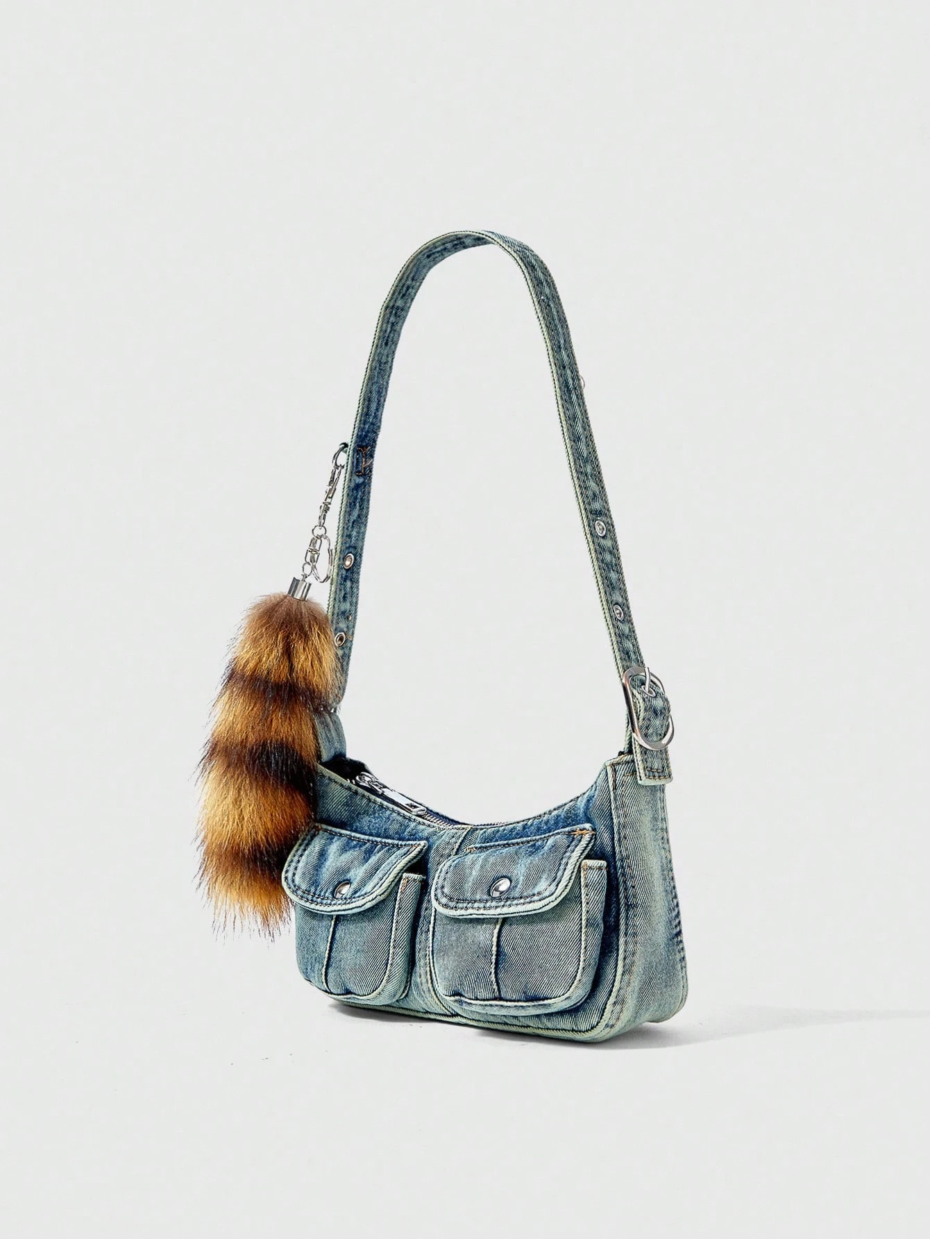 Grunge Punk 1pc Double Pocket Shoulder Bag With Faux Fur Tail Charm, Fashionable Personalized Vacation Style Women Handbag (Includes 1 Bag And 1 Set Of Accessories)