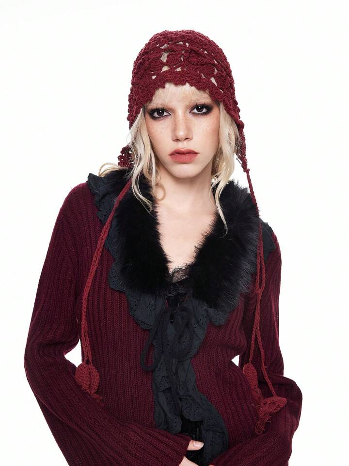 Grunge Punk 1pc Handmade Winter Flower & Tassel Knit Hat For Women
