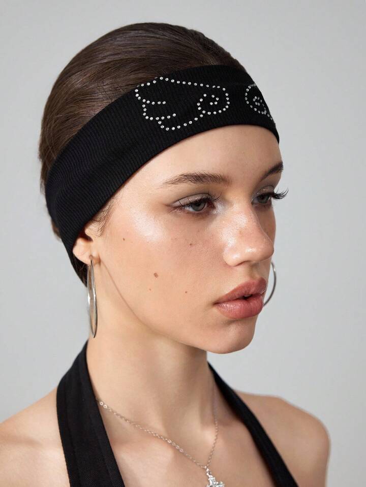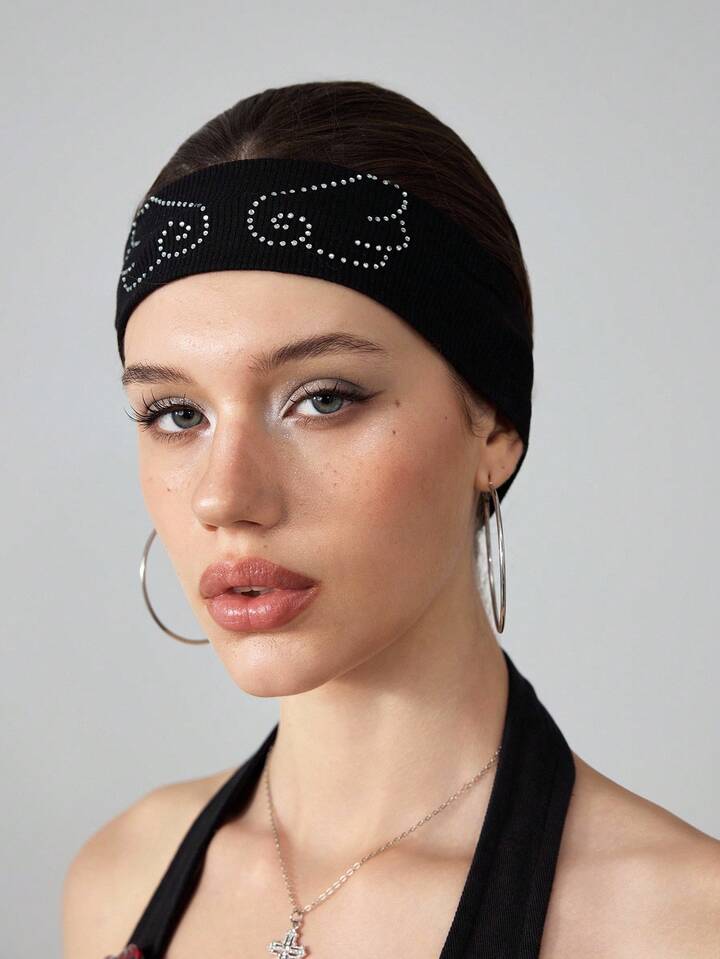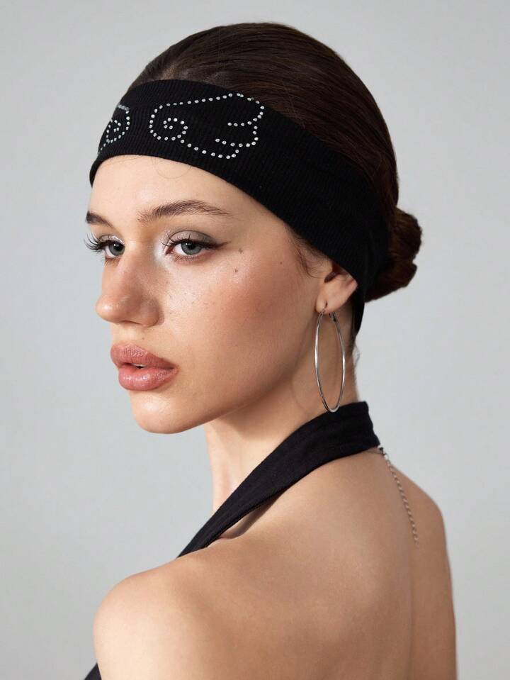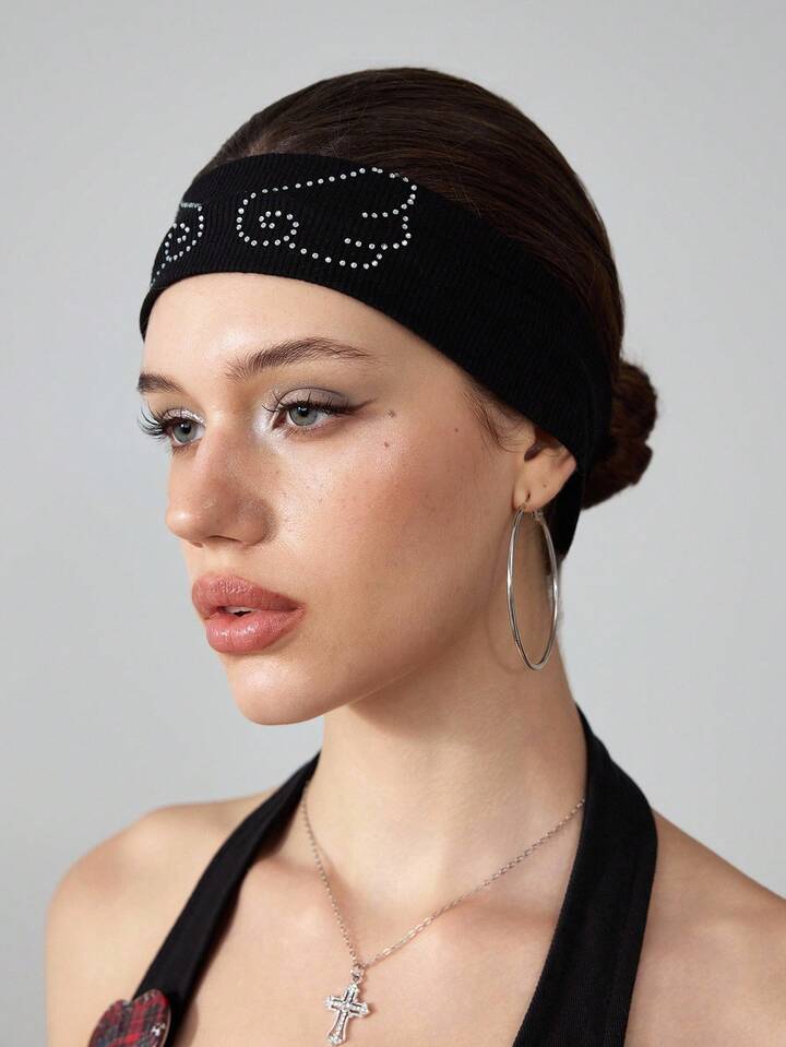 Grunge Punk 1pc Punk Style Wing Pattern Rhinestone Knitted Headband, Minimalist Solid Black Headband, Sweat-Absorbent Sports Yoga Headband, Versatile Daily Fashion Accessory