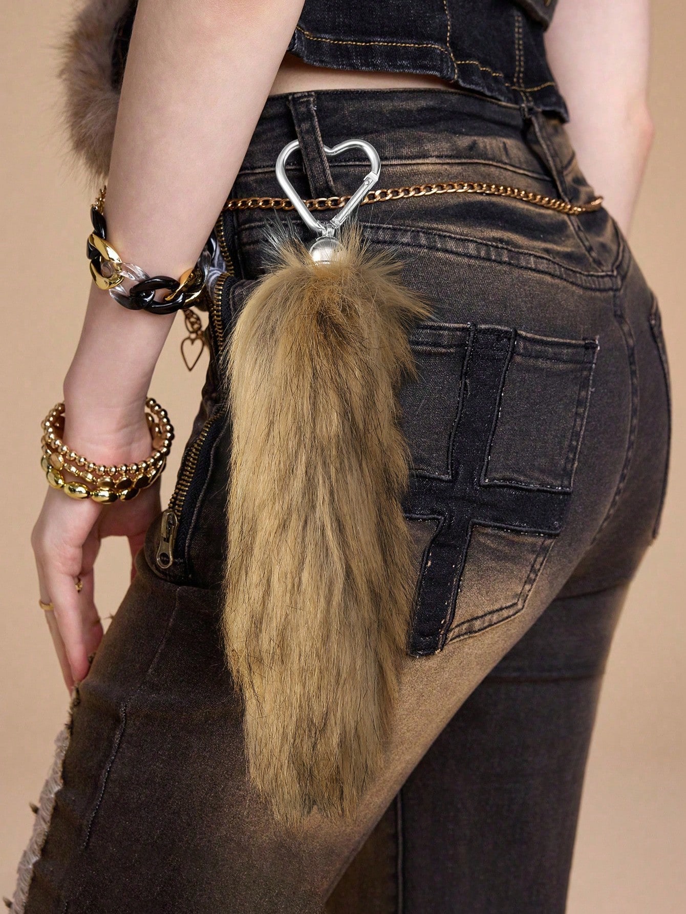 Grunge Punk 1pc Retro Elegant Minimalist Versatile High-Quality Glittery Brown Faux Fur Animal Tail Keychain & Bag Charm, Suitable For Women/Girls, Ideal Gift For Daily Wear Or Festivals