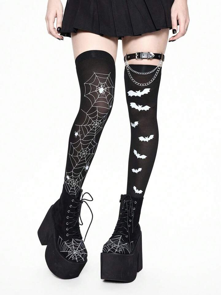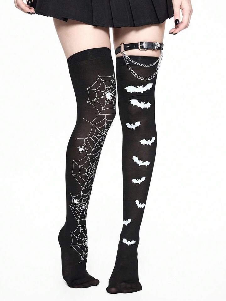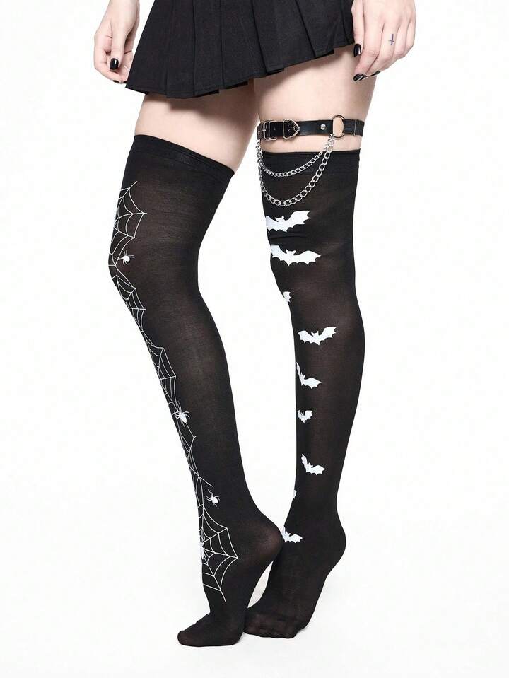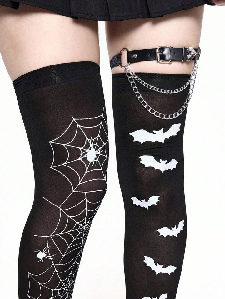 Grunge Punk 1pc Spider Web Thigh High Socks + 1pc Chain Heart Leg Garter + 1pc Bat Thigh High Socks, Y2K Style Outfit Set, Suitable For Daily Wear And Parties