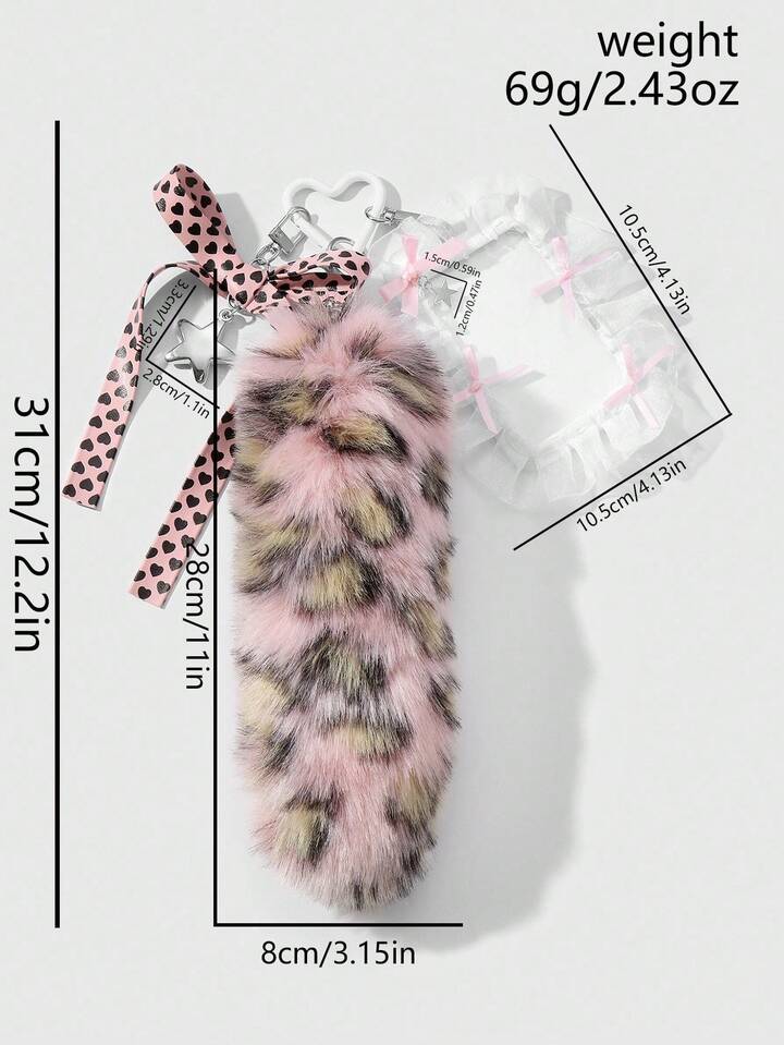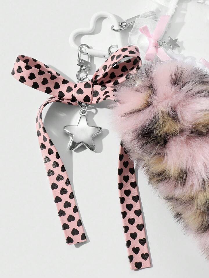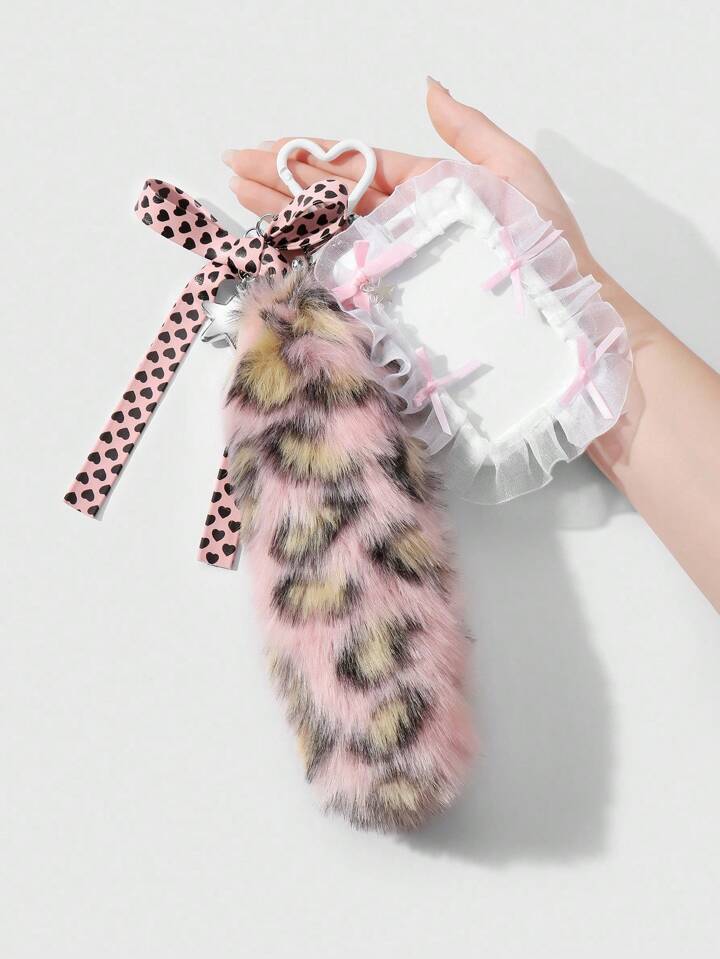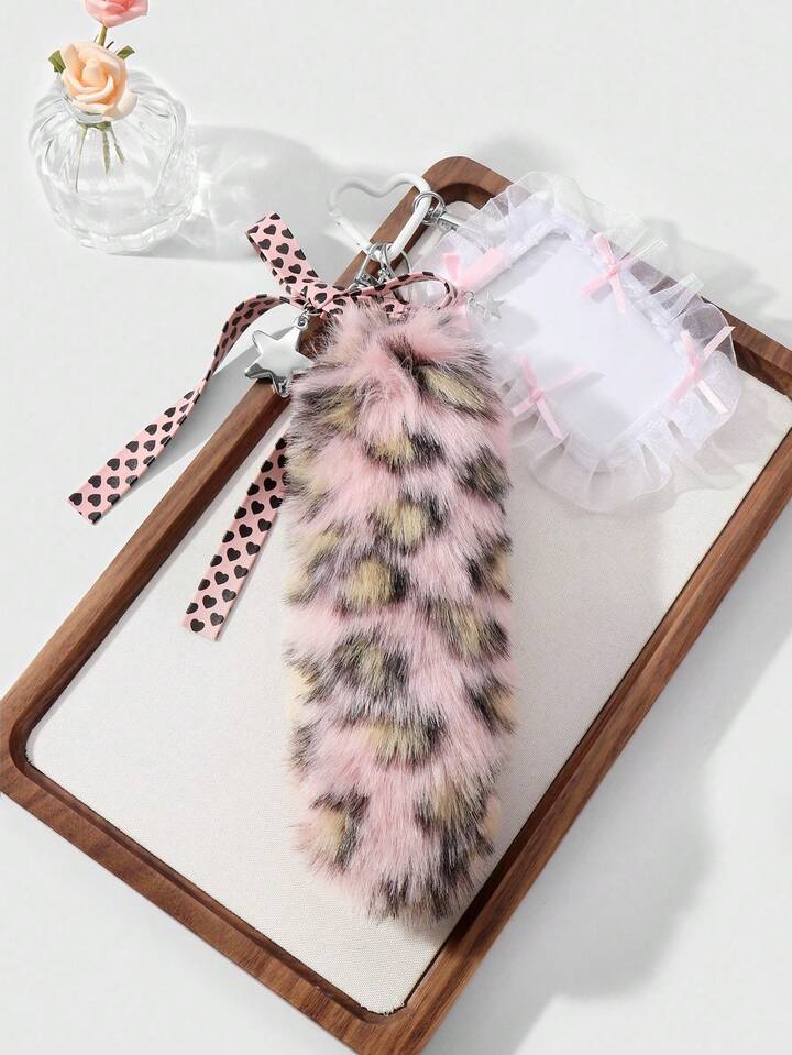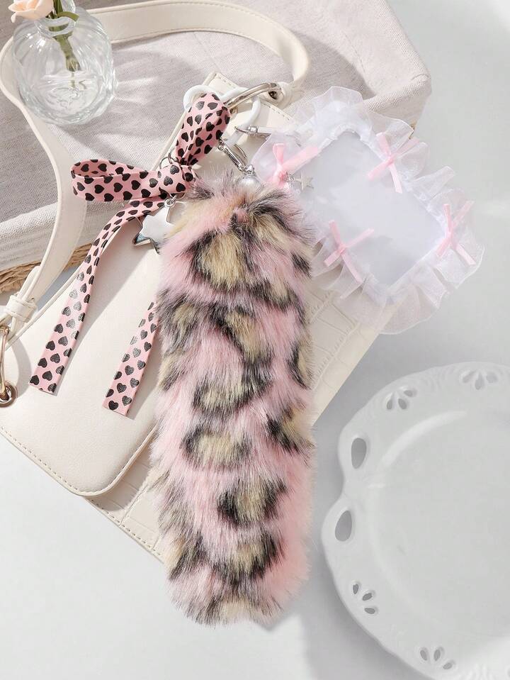 Grunge Punk 1pc Y2K Retro Chic Sophisticated Pink Leopard Print Faux Fur Animal Tail Leather Heart Bow CCB Star Mesh Flower Edge Card Holder Keychain Bag Charm, Suitable For Office Workers, Students, Daily Wear, Holiday Gift