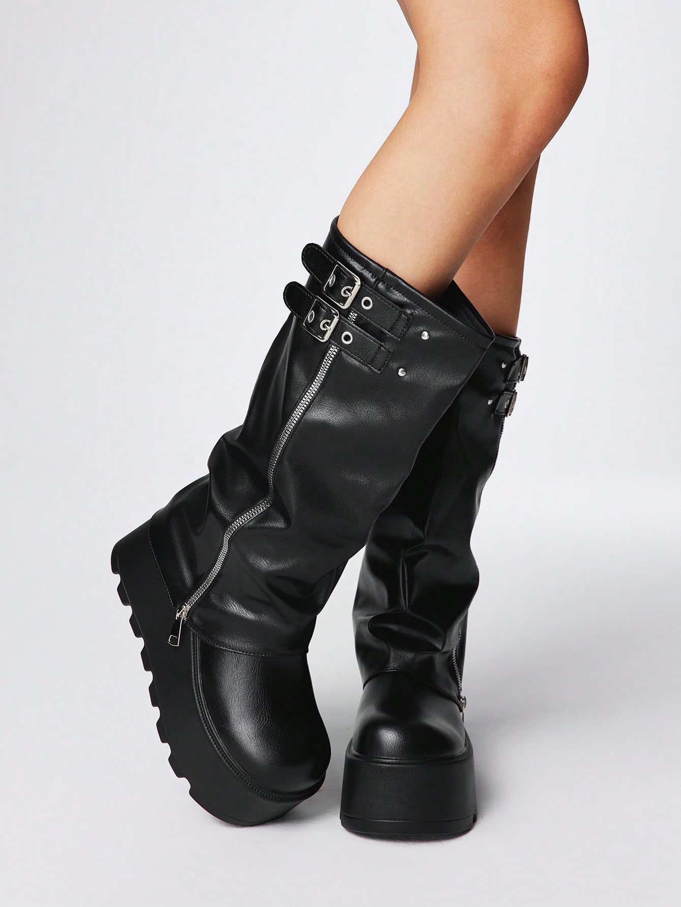 Grunge Punk 2025 Autumn/Winter New Round Toe Thick Sole Punk Style Buckle Zipper Design Pants Leg Boots, Leather Outdoor Fashion Slip-On Mid-Calf Boots