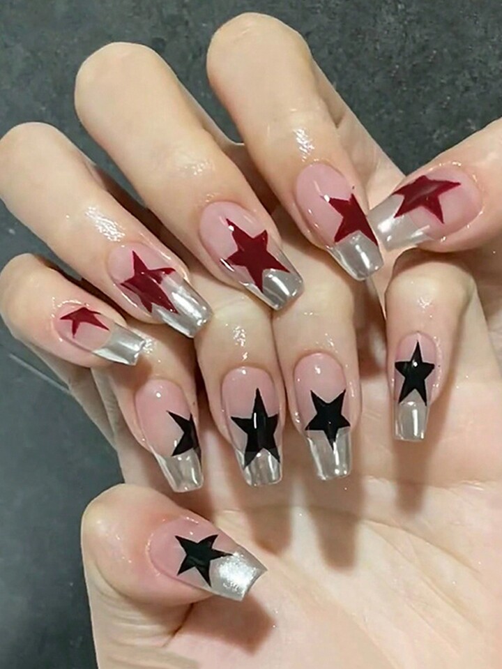 Grunge Punk 24pcs Long Coffin Star Pattern Colorblock Fake Nail Kit